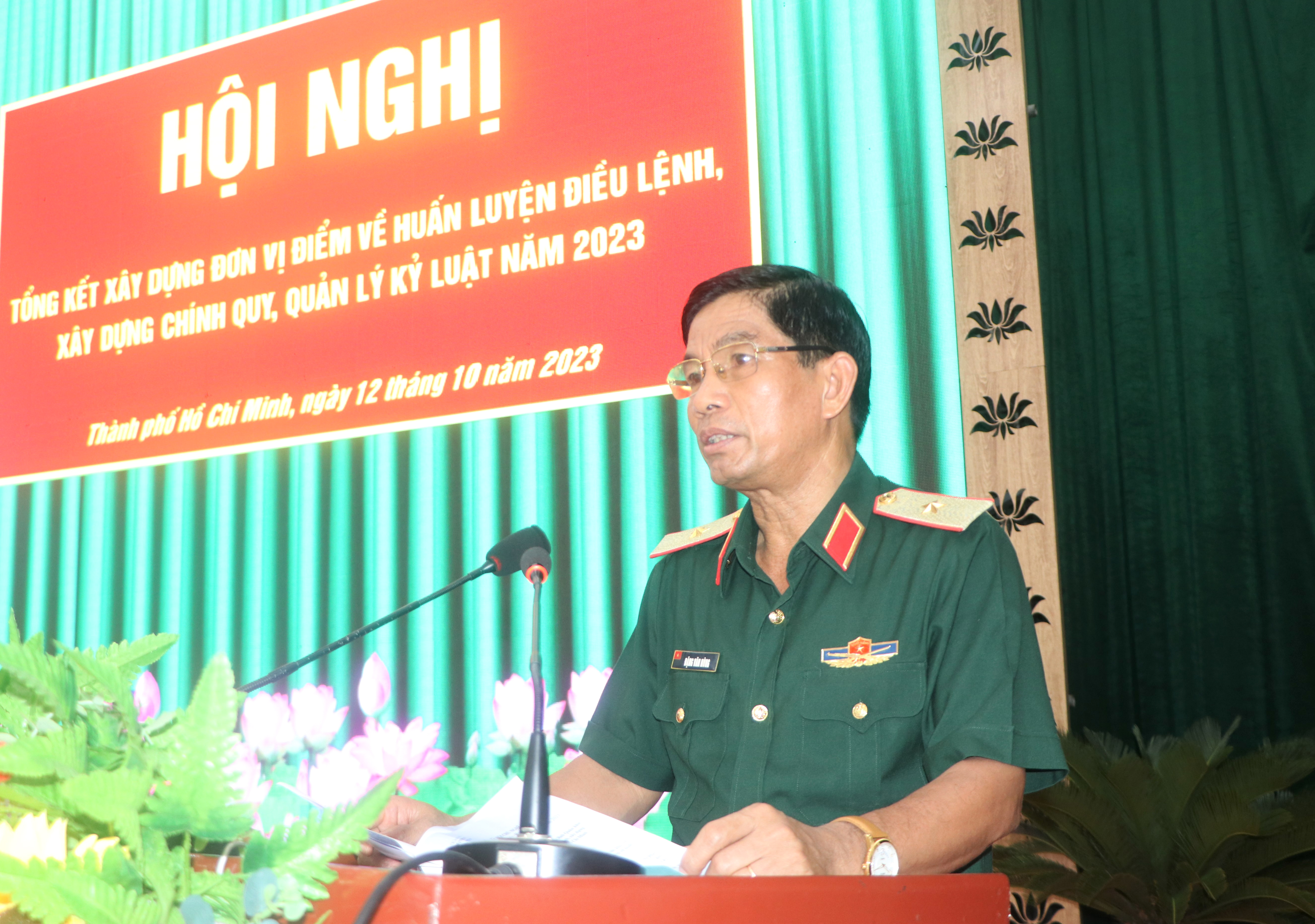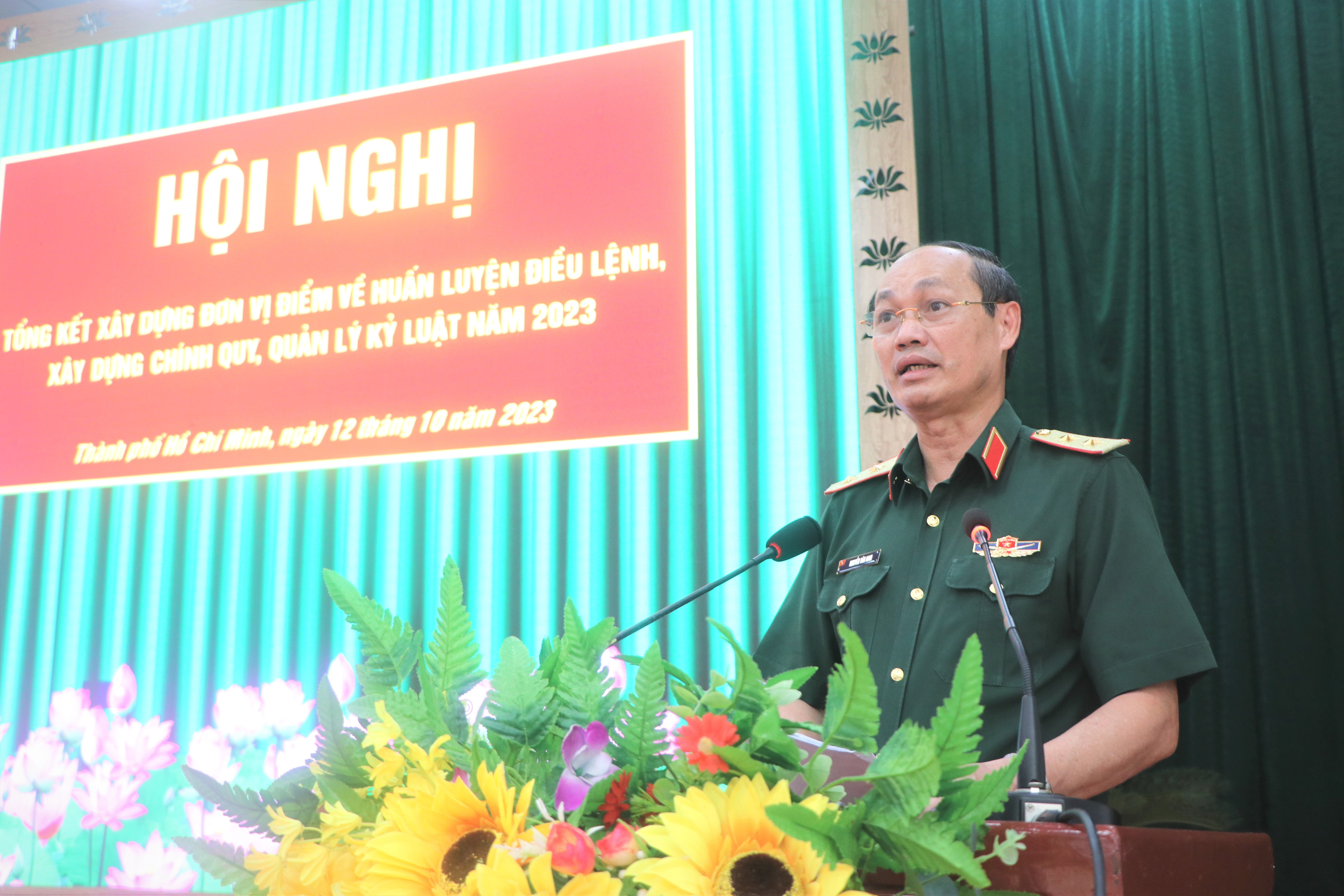 (QK7 Online) - Ngày 12-10, Bộ Tư lệnh Thành phố Hồ Chí Minh tổ chức hội nghị tổng kết xây dựng đơn vị điểm về huấn luyện điều lệnh, xây dựng chính quy, quản lý kỷ luật. Trung tướng Nguyễn Văn Nam, Tư lệnh Bộ Tư lệnh Thành phố Hồ Chí Minh chủ trì. Thiếu tướng Đặng Văn Hùng, Phó Tư lệnh, Tham mưu trưởng Quân khu dự, chỉ đạo hội nghị.