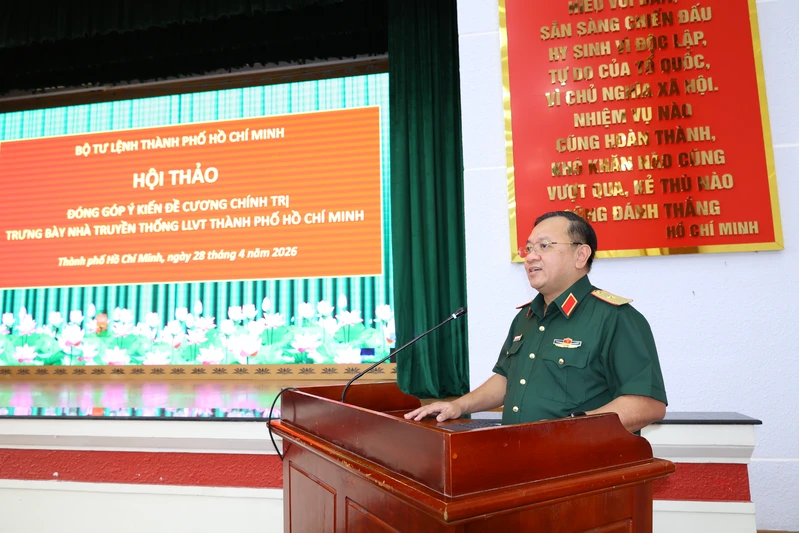 (QK7 Online) - Sáng 28/4, Bộ Tư lệnh TP. Hồ Chí Minh tổ chức Hội thảo đóng góp ý kiến Đề cương Chính trị trưng bày Nhà truyền thống Lực lượng vũ trang (LLVT) Thành phố Hồ Chí Minh và nâng cấp khu trưng bày Bộ Tư lệnh Thành phố Hồ Chí Minh. Trung tướng Lê Xuân Thế, Ủy viên Ban Chấp hành Trung ương Đảng, Ủy viên Quân ủy Trung ương, Tư lệnh Quân khu dự, phát biểu chỉ đạo và tham luận tại Hội thảo. Thiếu tướng Nguyễn Thành Trung, Thành ủy viên, Phó Bí thư Thường trực Đảng ủy Quân sự, Chính ủy Bộ Tư lệnh TP. Hồ Chí Minh chủ trì Hội thảo.