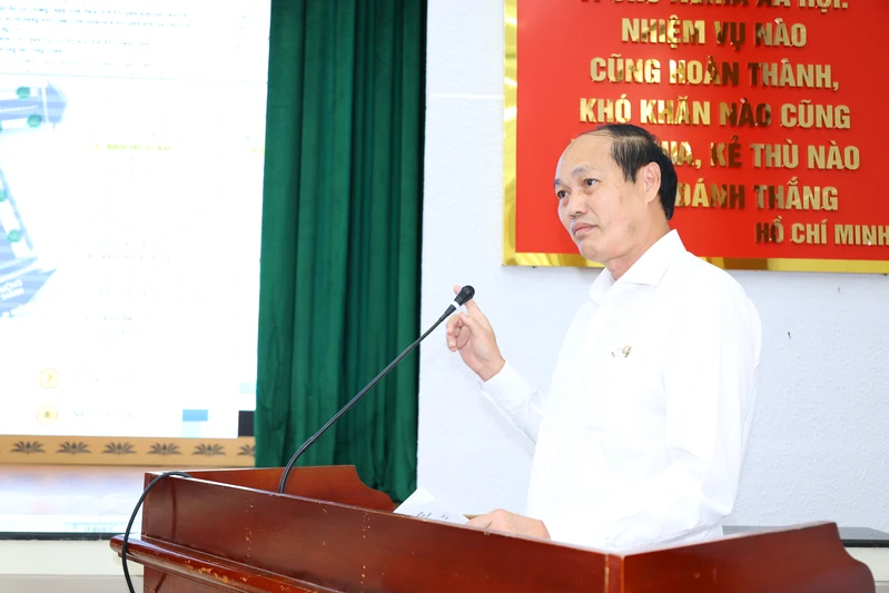 Tiến sĩ Phạm Hữu Mý, nguyên Giám đốc Trung tâm bảo tồn di tích TP. Hồ Chí Minh, đơn vị nhà thầu thiết kế trình bày báo cáo đề cương trưng bày Nhà truyền thống Lực lượng vũ trang Thành phố Hồ Chí Minh.