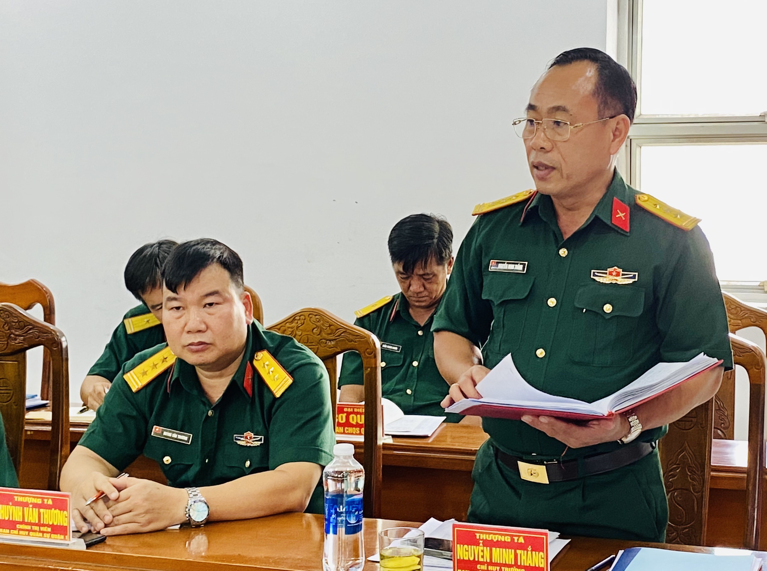 Thượng tá Nguyễn Minh Thắng, Chỉ huy trưởng Ban CHQS Quận 1 báo cáo kết quả thực hiện nhiệm vụ quân sự, quốc phòng địa phương trong 6 tháng đầu năm 2024.