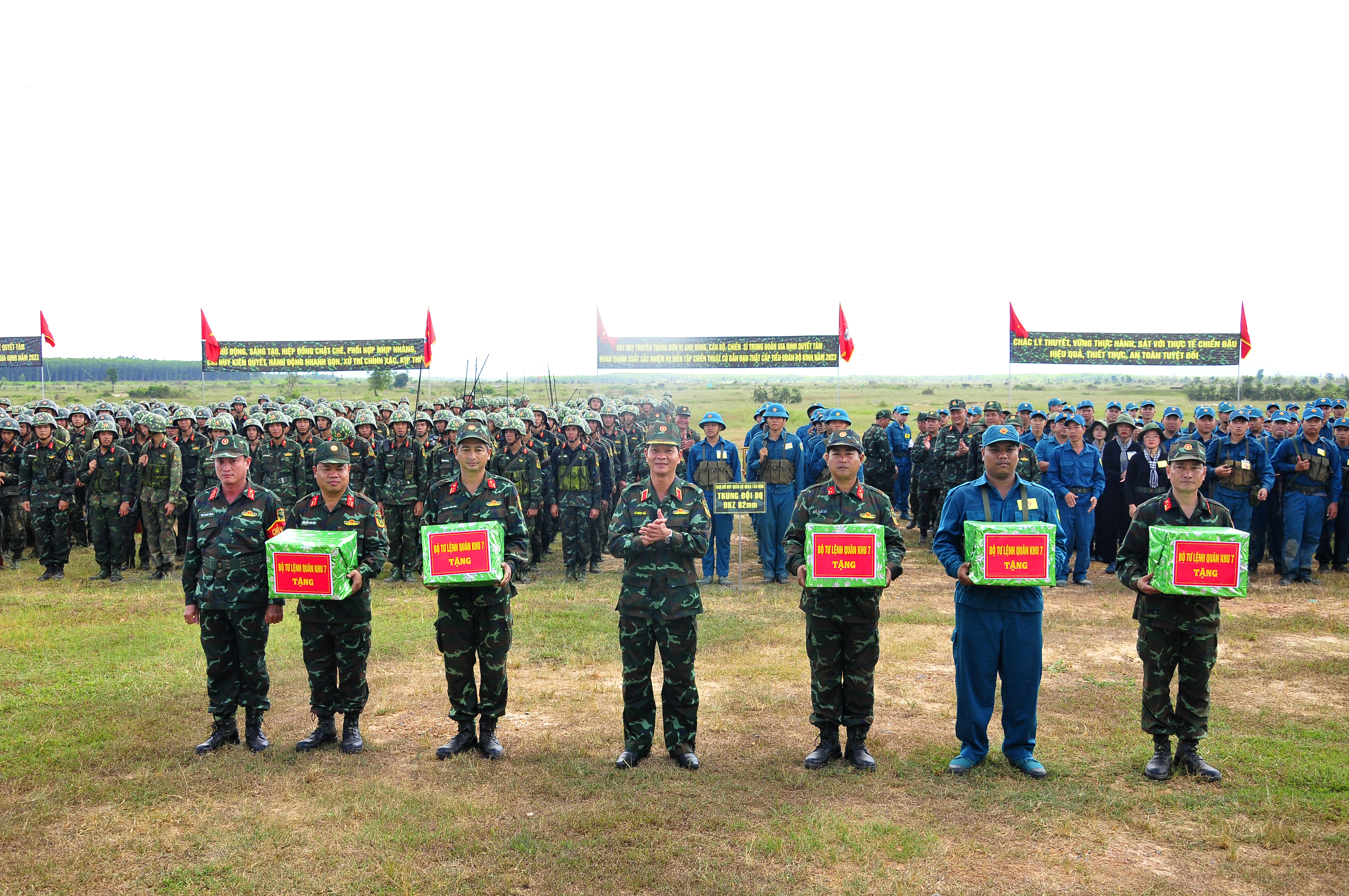 Thiếu tướng Lê Ngọc Hải, Phó Tham mưu trưởng Quân khu 7 tặng quà các đơn vị diễn tập.
