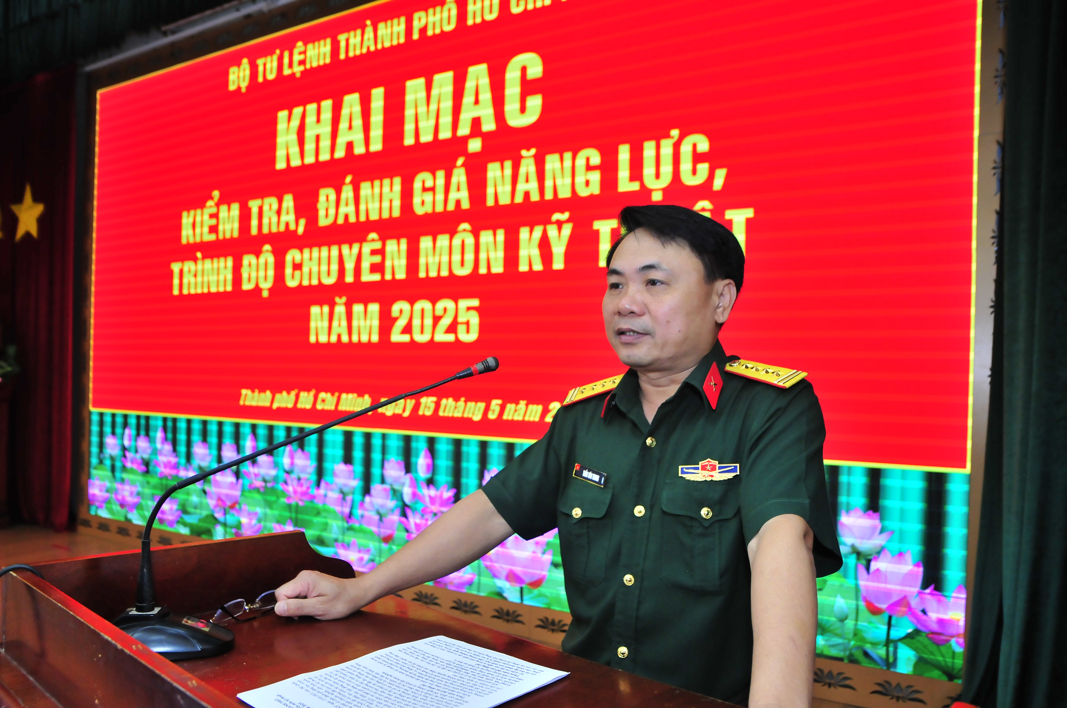(QK7 Online) - Sáng 15/5, Bộ Tư lệnh TPHCM tổ chức khai mạc kiểm tra, đánh giá năng lực trình độ chuyên môn kỹ thuật năm 2025. Dự khai mạc có Đại tá Trần Văn Trung, Chủ nhiệm Chính trị Bộ Tư lệnh TPHCM; Thượng tá Nguyễn Văn Hậu, Phó Tham mưu trưởng Bộ Tư lệnh TPHCM.