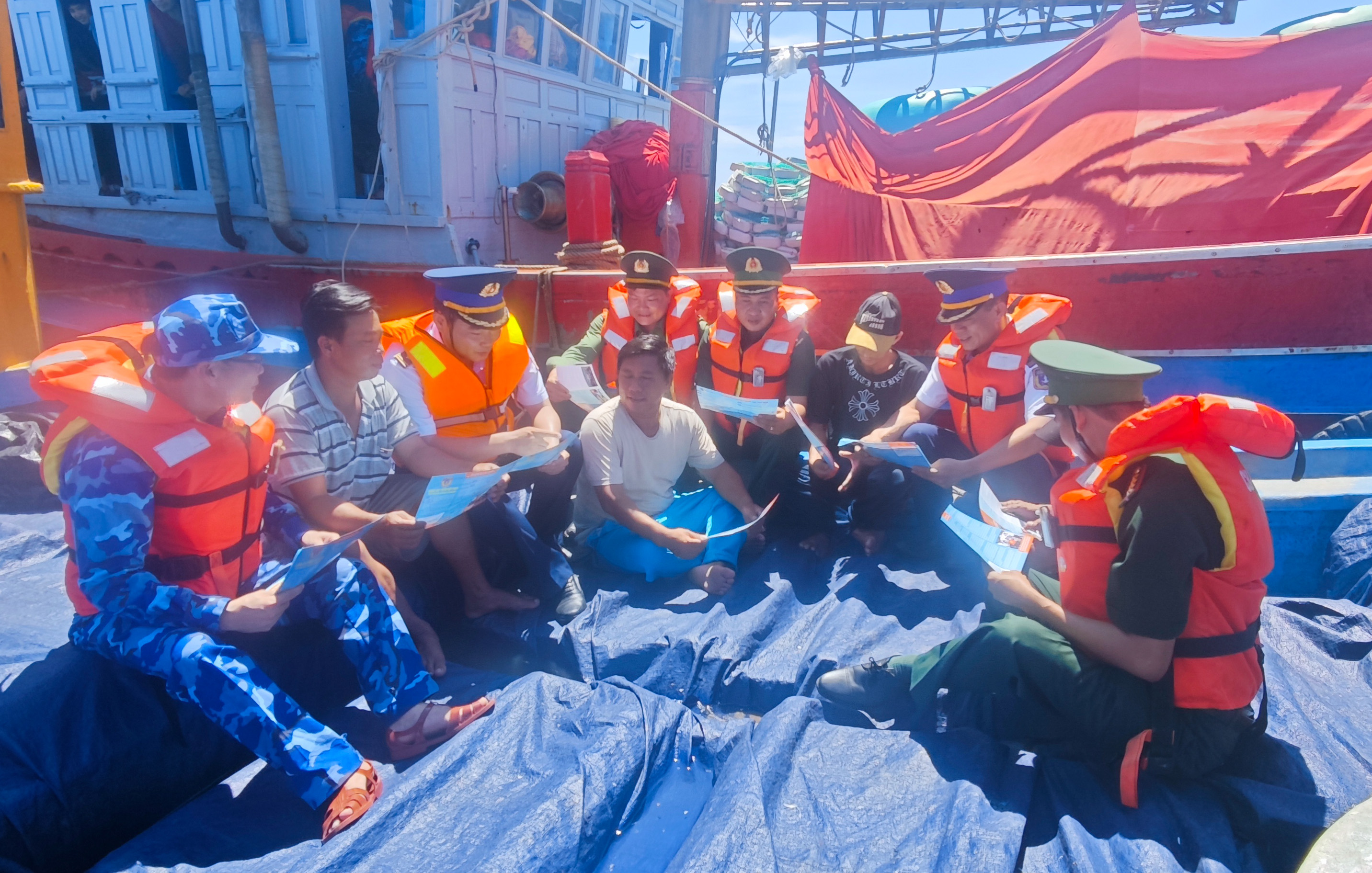 Trong khuôn khổ chương trình khảo sát thực địa, nắm tình hình an ninh chính trị, trật tự an toàn xã hội tại các vùng biển, đảo ven bờ, đoàn công tác đã đến tận các tàu cá đang neo đậu tại khu vực bãi Phủ – một trong những bãi đậu tàu trọng yếu của huyện đảo để gặp gỡ, trò chuyện và trực tiếp tuyên truyền cho ngư dân về các nội dung quan trọng như: Tình hình biển, đảo thời gian qua; Luật Biển Việt Nam; Luật Cảnh sát biển Việt Nam; các quy định pháp luật; các biện pháp phòng, chống khai thác hải sản bất hợp pháp, không báo cáo và không theo quy định (IUU).