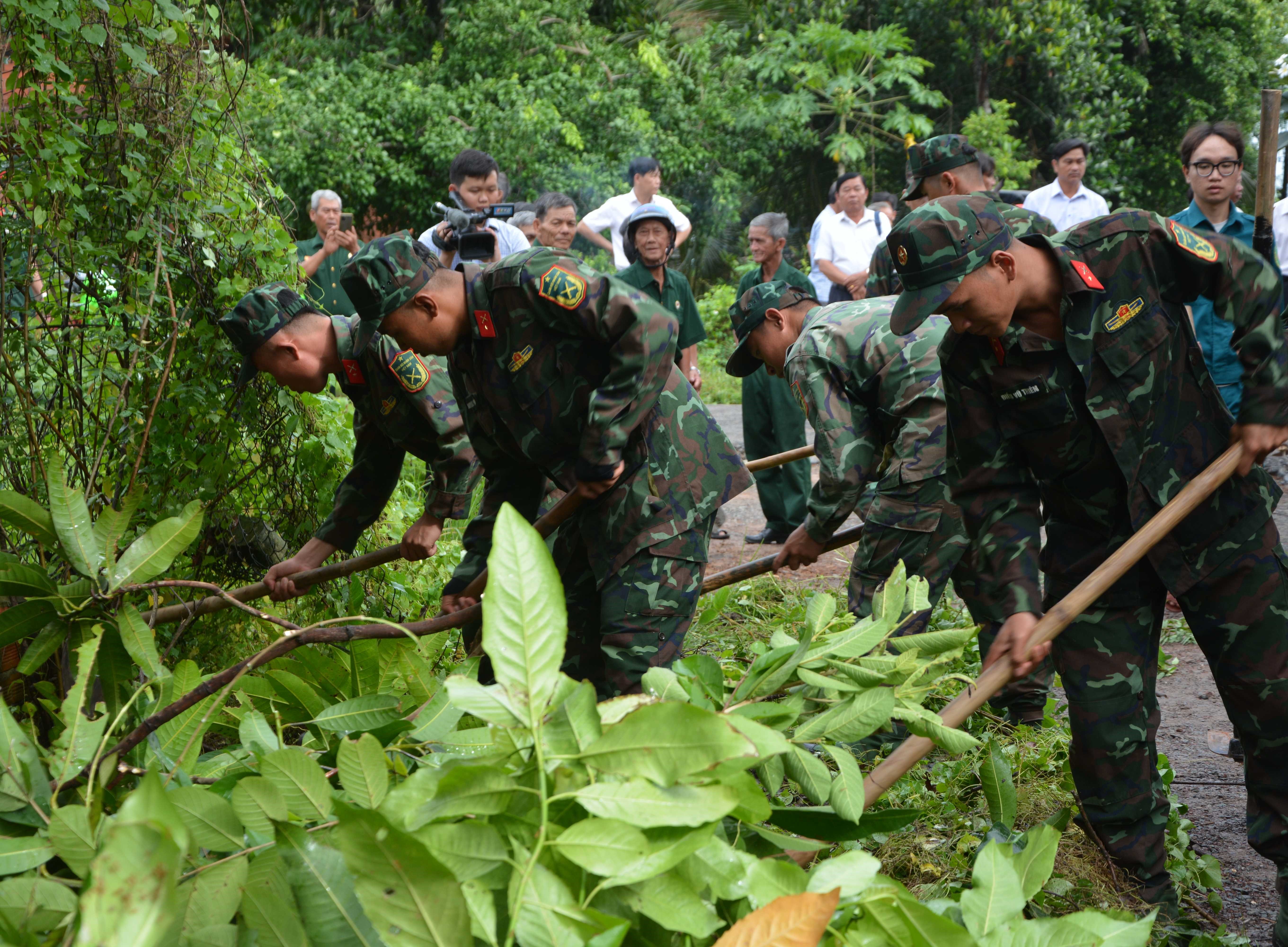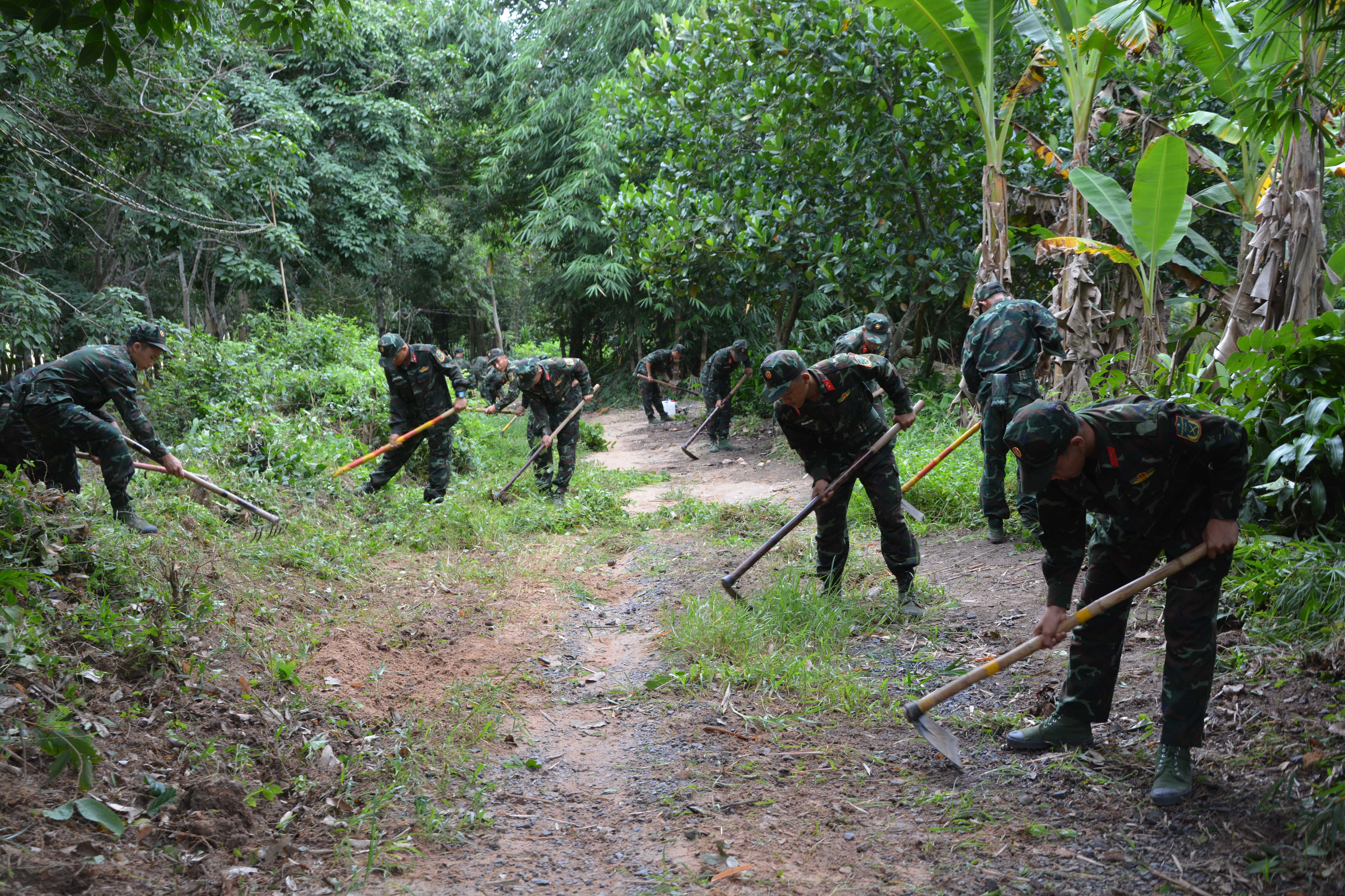 Cán bộ, chiến sĩ Trung đoàn 4, Sư đoàn 5 vệ sinh đường giao thông nông thôn tại xã Long Vĩnh, huyện Châu Thành.