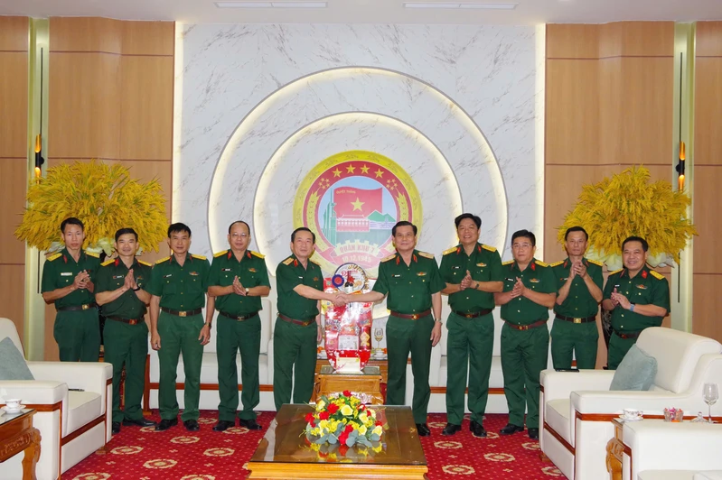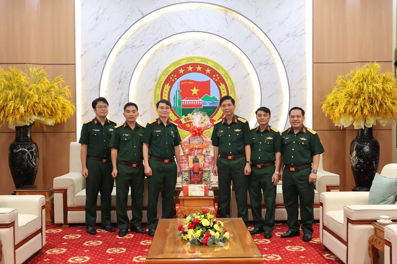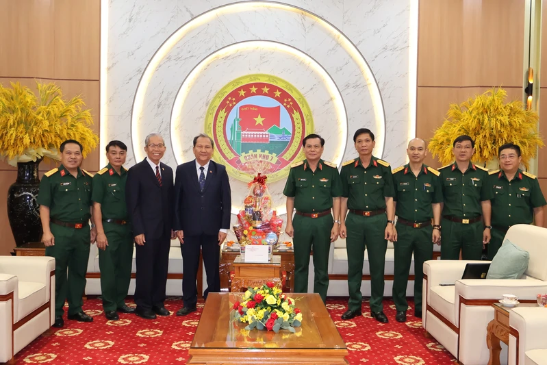 Đại tá Mau La, Phó Chỉ huy trưởng Tiểu khu Quân sự Svay Rieng, Campuchia (thứ 4 từ trái sang) làm trưởng đoàn đến thăm, chúc Tết Bộ Tư lệnh Quân khu 7.