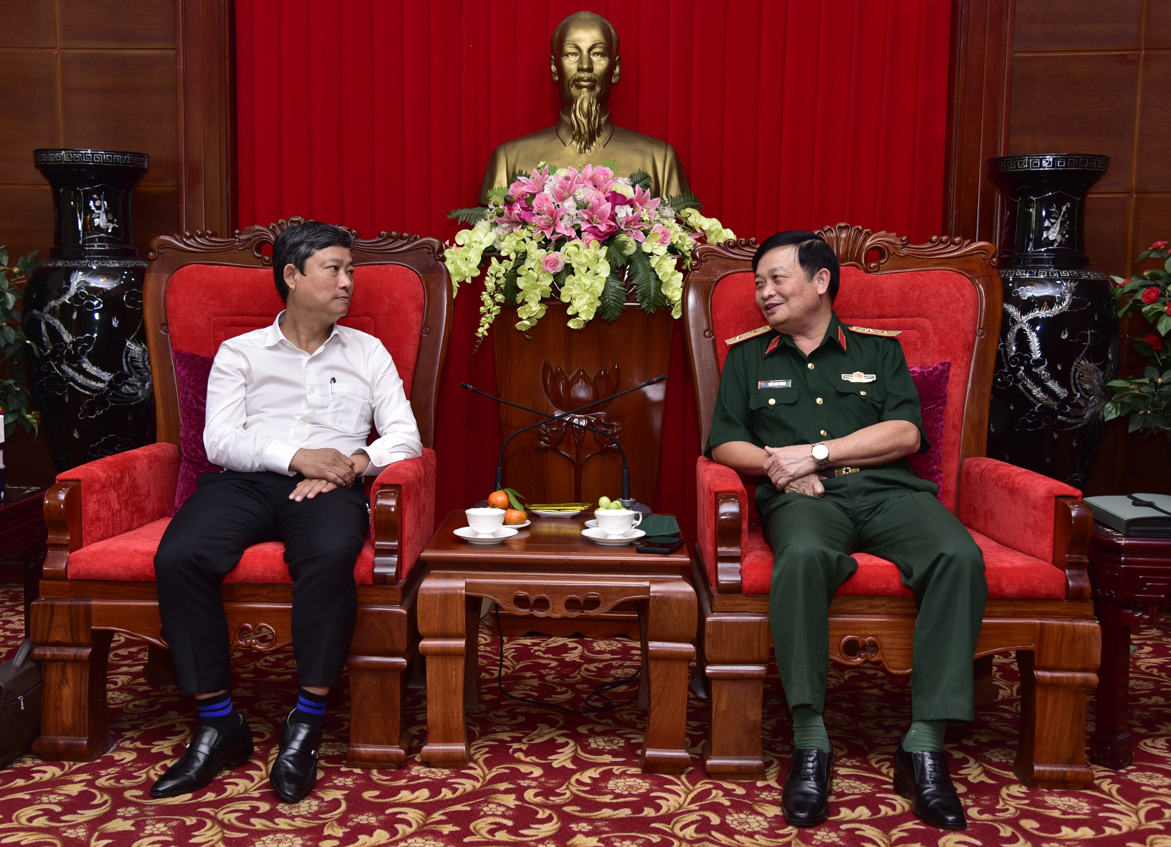 (QK7 Online) – Chiều 28 tháng 12, Đoàn công tác tỉnh Bình Dương do đồng chí Võ Văn Minh, Chủ tịch UBND tỉnh làm trưởng đoàn và Đoàn công tác tỉnh Đồng Nai do đồng chí Cao Tiến Dũng, Chủ tịch UBND tỉnh Đồng Nai đến thăm, tặng quà tri ân Bộ Tư lệnh Quân khu đã tham gia tuyến đầu phòng, chống dịch Covid-19 tại địa phương. Tiếp đoàn có Trung tướng Trần Hoài Trung, Bí thư Đảng ủy, Chính ủy Quân khu và thủ trưởng các cơ quan Quân khu.