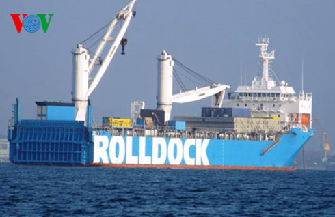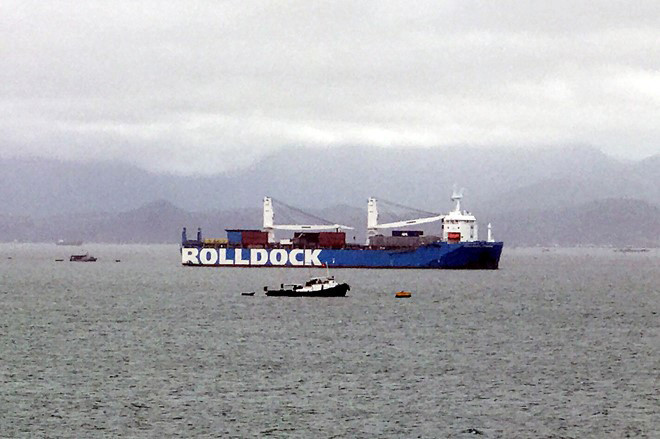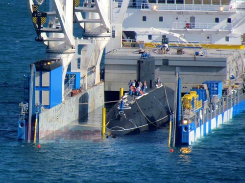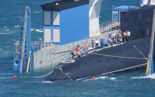 Ngày 31/1/2015, tại vịnh Cam Ranh, tỉnh Khánh Hòa, tàu vận tải hạng nặng Rolldock Star đã được các chuyên gia bơm nước vào các khoang trong vòng nhiều giờ để hạ chìm kỹ thuật, sau đó sử dụng hai tàu kéo để đưa tàu ngầm QH-184 Hải Phòng ra bên ngoài. (Ảnh: Tuổi trẻ)