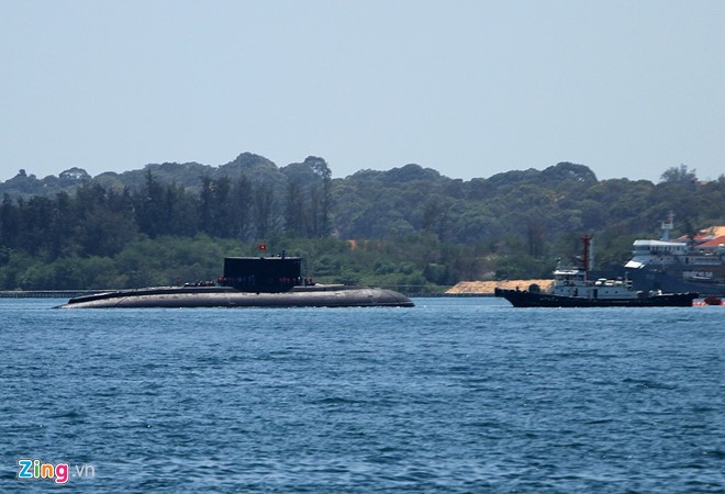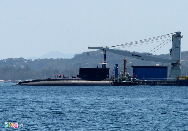 Tàu ngầm Kilo 185 - Khánh Hòa giương cờ Tổ quốc khi tiến vào khu vực neo đậu cùng 3 tầu ngầm tại đây. Tàu ngầm kilo 185 - Khánh Hòa được tàu Rolldock Storm chở từ Nga về Cam Ranh ngày 30/6. Đây là chiếc tàu ngầm lớp kilo thứ 4 trong số 6 tàu ngầm cùng loại mà Việt Nam đặt hàng Nga sản xuất. (Ảnh: Zing)