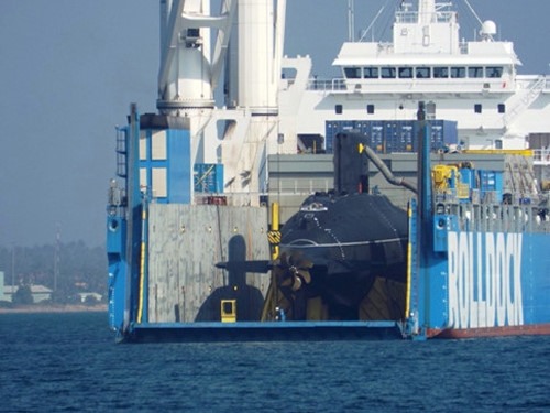 Tàu vận tải Rolldock Storm (Hà Lan), chở theo tàu ngầm Bà Rịa - Vũng Tàu đang neo đậu trong vịnh Cam Ranh sáng 20/1. 6 tàu ngầm Kilo mà phía Nga đóng theo đơn đặt hàng của Việt Nam trang bị nhiều khí tài hiện đại, được mệnh danh là "hố đen" trong lòng đại dương. (Ảnh: Zing)
