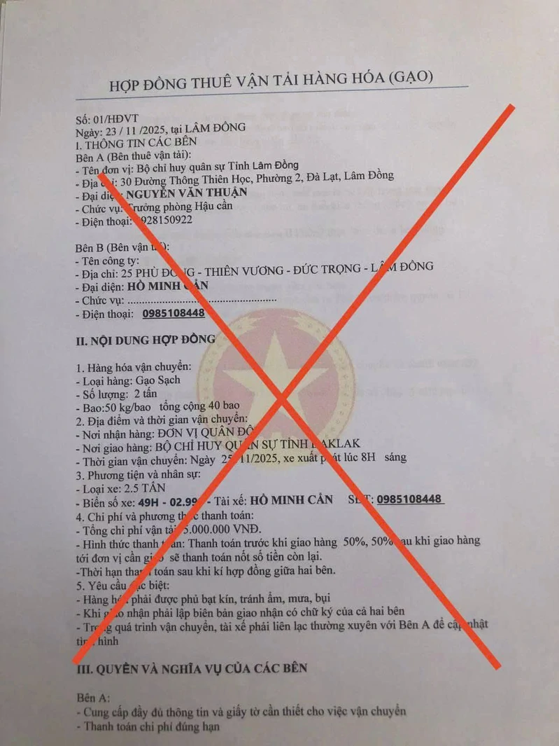 (QK7 Online) - Trong tình hình Quân đội đang huy động lực lượng phòng chống thiên tai, bão lũ. Lợi dụng lòng tin của Nhân dân đối với quân đội, thời gian gần đây, Bộ Chỉ huy Quân sự (CHQS) tỉnh Lâm Đồng đã phát hiện một số đối tượng đã sử dụng mạng xã hội, đặc biệt là Zalo và Facebook, giả danh Bộ CHQS tỉnh Lâm Đồng cùng một số đơn vị trực thuộc để tung tin kêu gọi quyên góp lương thực, thực phẩm hoặc thuê phương tiện vận chuyển “hỗ trợ đồng bào miền Trung bị bão lũ”. Để tạo lòng tin, chúng gửi kèm “hợp đồng”, “giấy ra vào cổng đơn vị quân đội” với hình thức cẩu thả, có nhiều sai sót trong thể thức, con dấu và chữ ký.