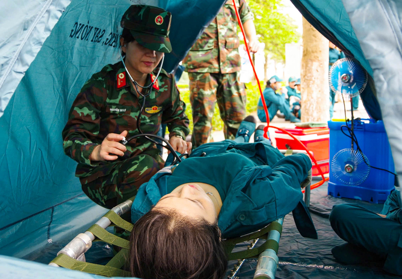 Thiếu tá Lê Đình Cường, Bác sĩ Phòng Quân y, Cục Hậu cần - Kỹ thuật Quân khu cho biết: “Hàng ngày trước các buổi tập sáng, chiều, Tổ quân y chúng tôi đều tổ chức đo quan trắc môi trường để có được các chỉ số như nhiệt độ, sức gió, độ ẩm, chỉ số tia UV và kịp thời đưa ra các khuyến cáo về giờ tập, thời lượng tập, thời gian nghỉ ngơi cũng như số lượng nước uống điện giải bổ sung kịp thời cho bộ đội. Khi có trường hợp say nắng, say nóng, Tổ quân y nhanh chóng sơ cứu đưa chiến sĩ vào khu vực mát, tránh ánh nắng, tháo bỏ phương tiện trên người, xử trí lau mát liên tục, quạt gió tản nhiệt. Những trường hợp say nắng, say nóng mức độ vừa sẽ tiến hành truyền dịch và vận chuyển đến các lều chống say nắng, say nóng, phối hợp cùng đội ngũ quân y Bệnh viện Trung ương Quân đội 108 và Bệnh viện Quân y 103 đảm bảo nhanh chóng, kịp thời, hiệu quả. Trong các buổi hợp luyện, tổng hợp luyện Tổ quân y luôn cơ động bám sát đội hình, sẵn sàng tiếp nước, lau mát, xịt nước mát để giảm bớt sự nóng nực cho bộ đội”.