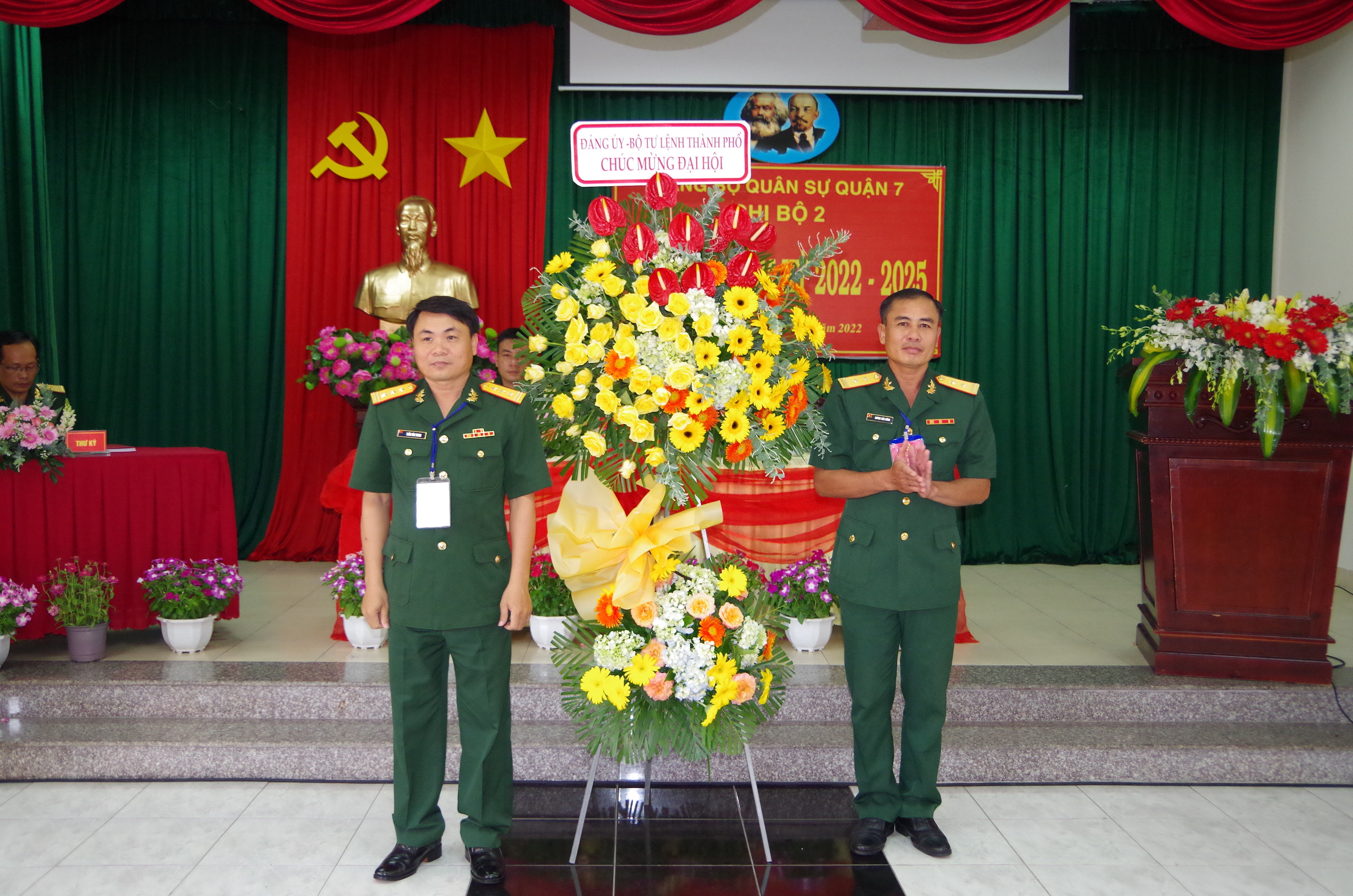 Thượng tá Trần Văn Trung, Phó Chủ nhiệm Chính trị Bộ Tư lệnh TPHCM (thứ 2 bên phải) và Trung tá Nguyễn Quốc Trầm, Phó Bí thư Đảng ủy Quân sự, Chính trị viên Ban CHQS Quận 7 tặng hoa chúc mừng cấp ủy nhiệm kỳ 2022 – 2025.