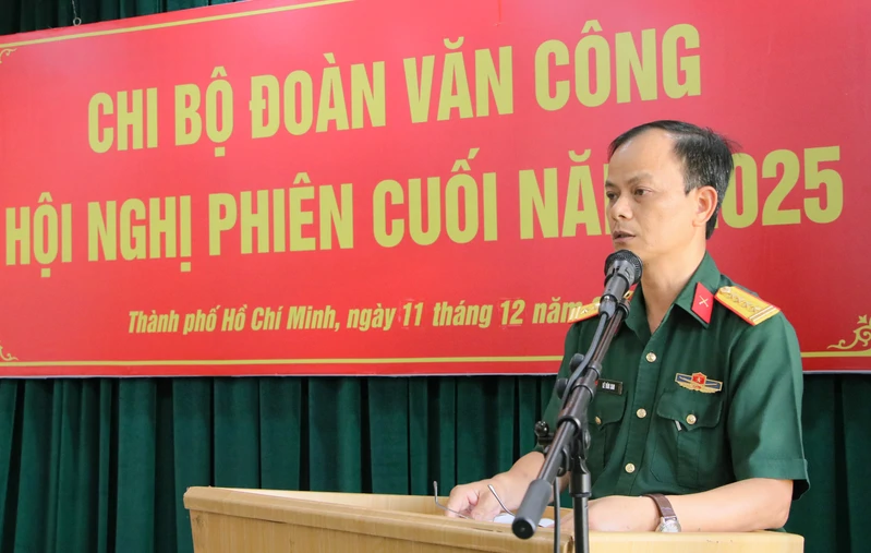 (QK7 Online) - Chiều 11/12, tại Thành phố Hồ Chí Minh, Chi bộ Đoàn Văn công Quân khu 7 tổ chức hội nghị phiên cuối năm 2025, ra nghị quyết lãnh đạo thực hiện nhiệm vụ năm 2026. Thiếu tướng Trần Đức Thắng, Bí thư Đảng ủy Cục Chính trị, Phó Chủ nhiệm Chính trị Quân khu dự, chỉ đạo hội nghị. Đại tá Lê Văn San, Bí thư Chi bộ, Chính trị viên Đoàn Văn công chủ trì hội nghị.