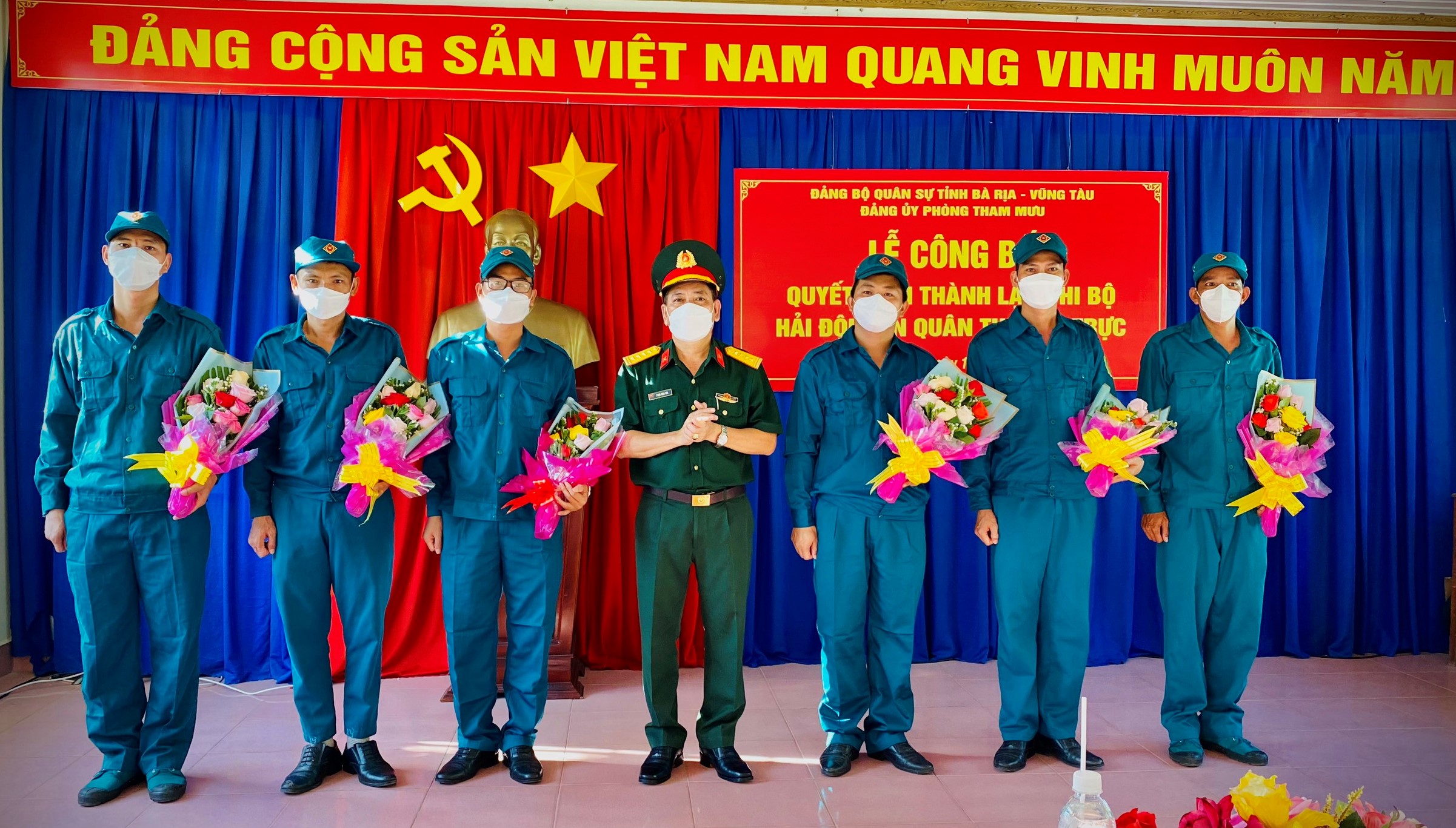 Đại tá Phạm Kinh Kha, Phó Chỉ huy trưởng, Tham mưu trưởng Bộ CHQS tỉnh Bà Rịa - Vũng Tàu tặng hoa chúc mừng cấp ủy chi bộ Hai đội dân quân thường trực.