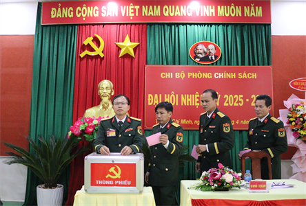 Đại hội Chi bộ Phòng Chính sách nhiệm kỳ 2025 - 2030 bầu ra Ban Chấp hành nhiệm kỳ mới là 3 đồng chí và bầu đại biểu đi dự Đại hội Đảng bộ Cục Chính trị Quân khu nhiệm kỳ 2025 - 2030 là 4 đồng chí (gồm 3 đồng chí chính thức và 1 đồng chí dự khuyết).