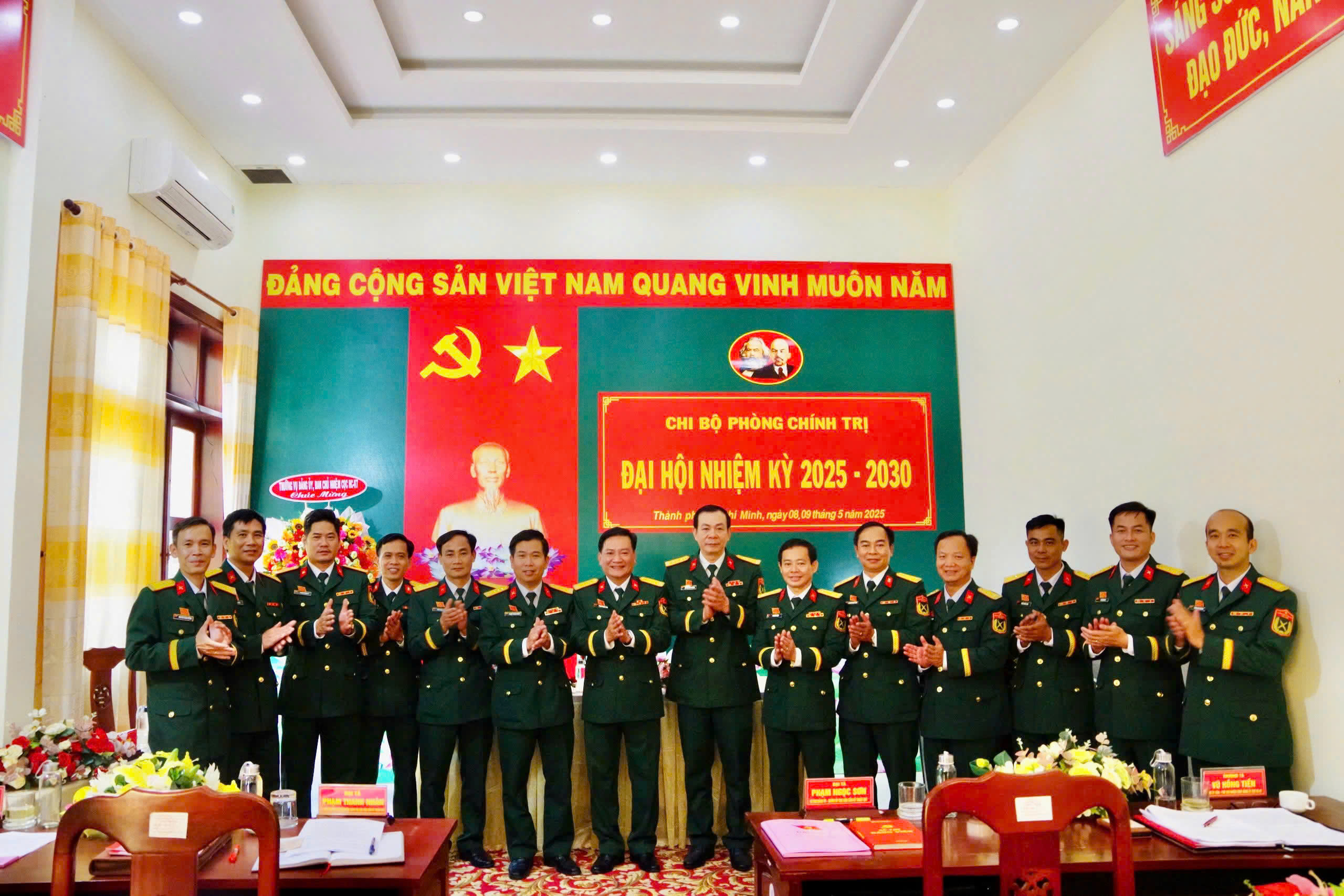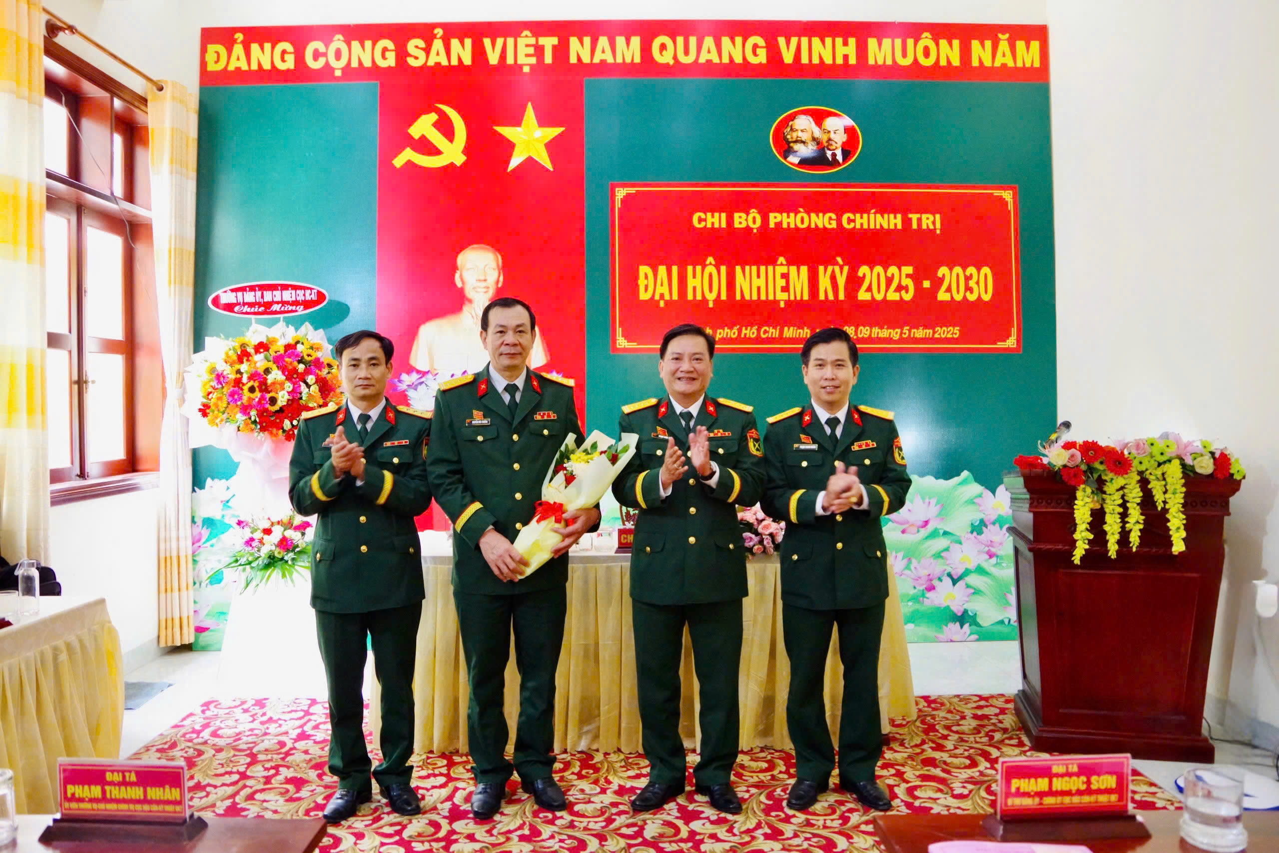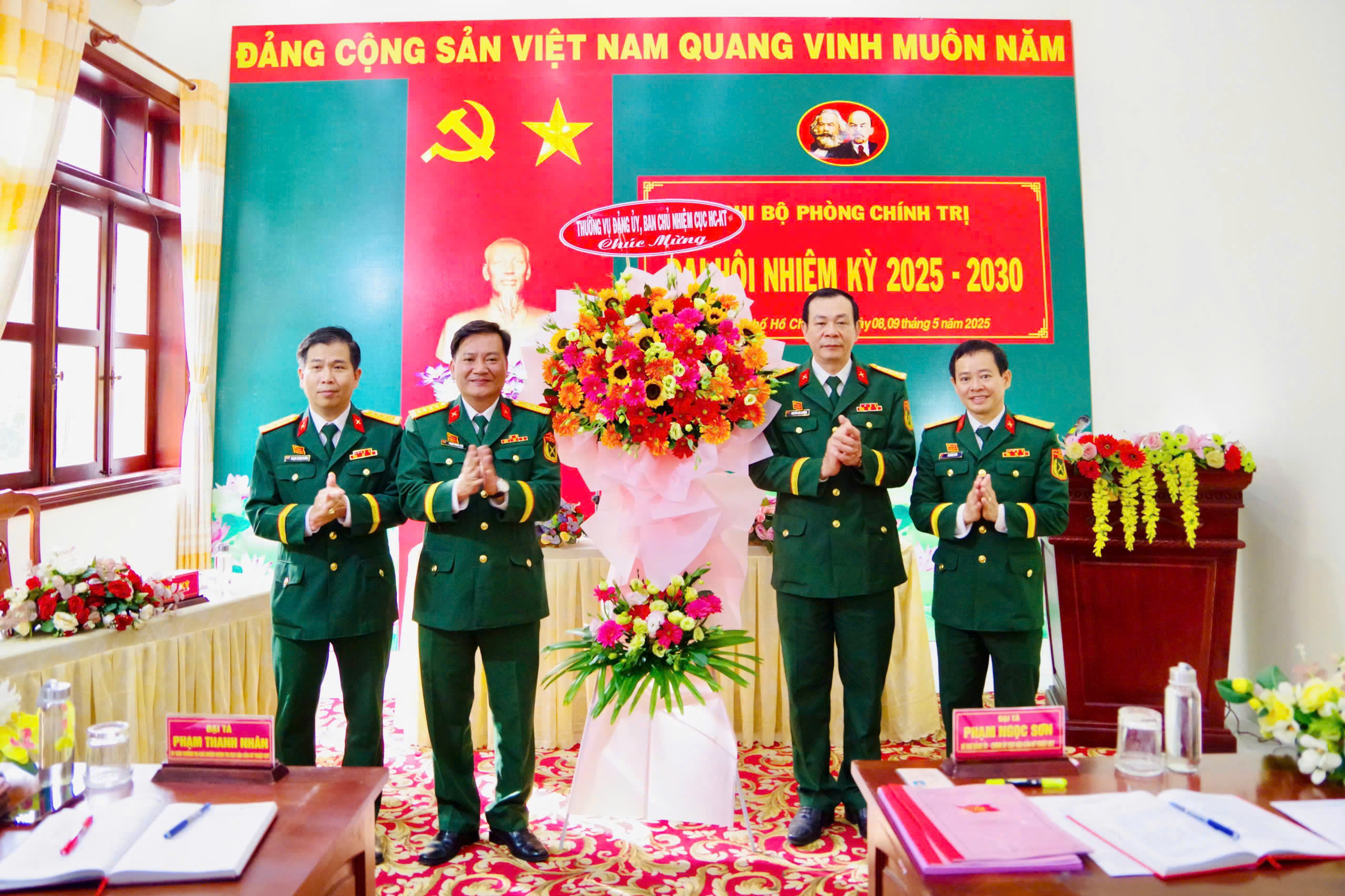 Đại tá Phạm Ngọc Sơn tặng hoa chúc mừng Ban chấp hành Chi bộ Phòng Chính trị nhiệm kỳ 2025 - 2030.