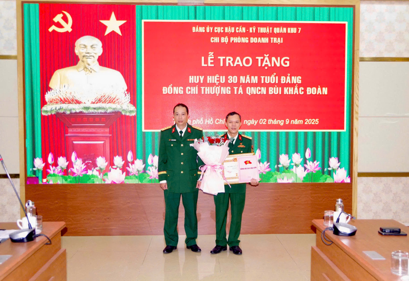 (QK7 Online) - Sáng 2/9, Chi bộ Phòng Doanh trại, Cục Hậu cần - Kỹ thuật Quân khu tổ chức Lễ trao tặng Huy hiệu 30 năm tuổi Đảng cho Thượng tá QNCN Bùi Khắc Đoàn, đảng viên sinh hoạt tại Chi bộ