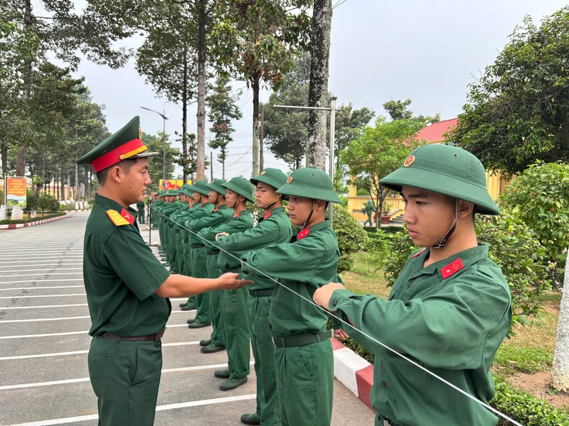 Cán bộ kiểm tra động tác cho chiến sĩ mới trong huấn luyện điều lệnh đội ngũ.