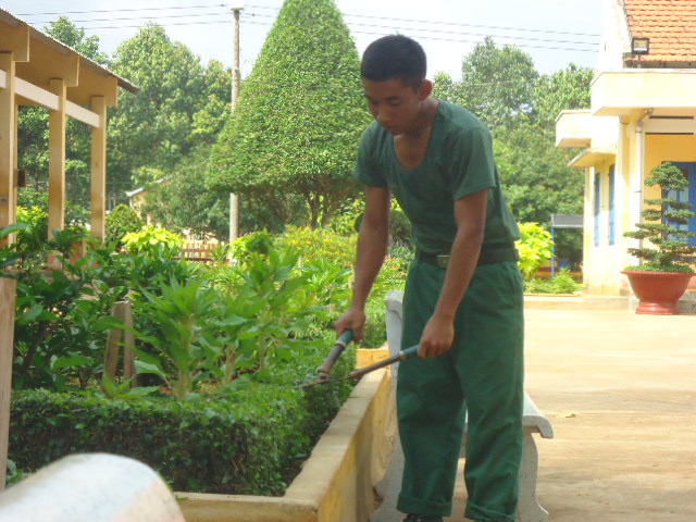Chiến sĩ Thanh Nhật Thoáng chăm sóc cây cảnh