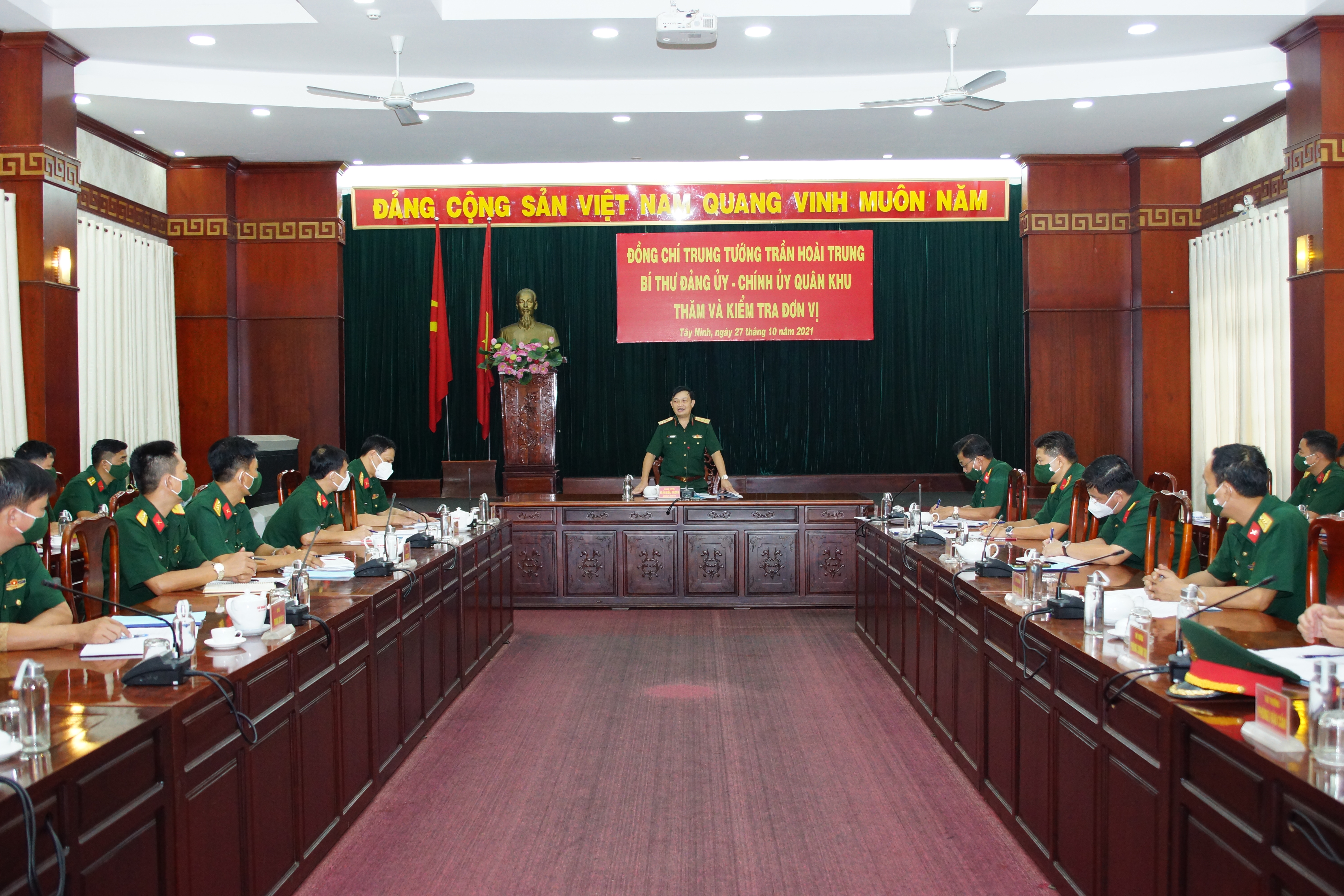 Trung tướng Trần Hoài Trung biểu dương và đánh giá cao kết quả thực hiện nhiệm vụ của lực lượng vũ trang tỉnh Tây Ninh và Sư đoàn 5 trong thời gian qua đã chủ động tham mưu, đề xuất, phối hợp chặt chẽ với các lực lượng xử lý các tình huống, không để xảy ra bị động, bất ngờ. Nâng cao chất lượng huấn luyện, sẵn sàng chiến đấu, đồng thời phối hợp chặt chẽ với cấp ủy, chính quyền địa phương giữ vững ổn định địa bàn; thực hiện nghiêm công tác phòng chống dịch Covid-19 không để dịch bệnh lây lan trong đơn vị, thực hiện tốt nhiệm vụ đưa lực lượng hỗ trợ các địa phương phòng, chống dịch hiệu quả.