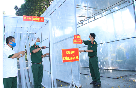 Lực lượng quân y Quân khu Bộ chuẩn bị khu vực khử khuẩn phương tiện vào căn cứ Trần Hưng Đạo.