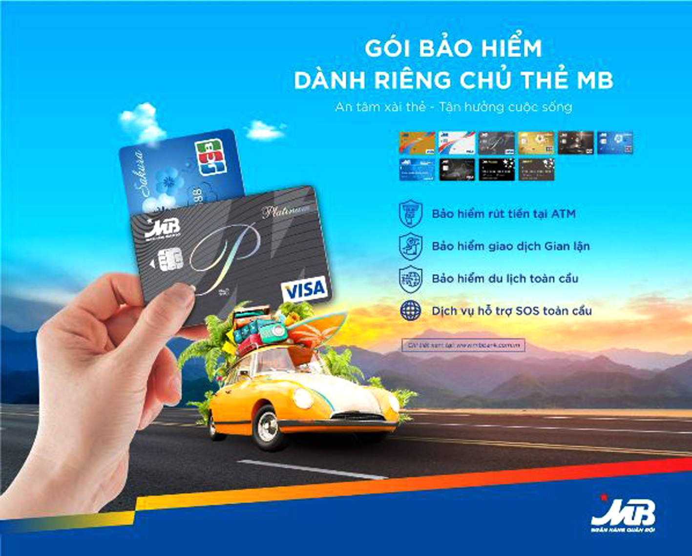 Chủ thẻ MB sẽ được hưởng các loại bảo hiểm như: Bảo hiểm rút tiền tại ATM (áp dụng thẻ tín dụng MB Visa, MB JCB, thẻ ghi nợ MB Visa Platinum, MB Vip hoặc MB Private) lên đến 200 triệu đồng/năm; Bảo hiểm giao dịch gian lận (áp dụng thẻ tín dụng MB Visa, MB JCB, thẻ ghi nợ nội địa và thẻ ghi nợ quốc tế MB Visa) lên đến 500 triệu đồng/năm và Bảo hiểm du lịch toàn cầu bao gồm: bảo hiểm tư trang chuyến đi, chuyến đi bị trì hoãn, bảo hiểm mua sắm… (áp dụng cho thẻ tín dụng MB Visa, MB JCB và thẻ ghi nợ MB Visa hạng Platinum trở lên) lên đến 21 tỷ đồng.