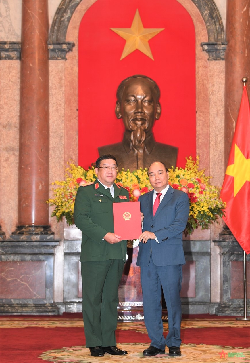 Chủ tịch nước Nguyễn Xuân Phúc trao quyết định thăng quân hàm trước niên hạn từ Phó đô đốc lên cấp Thượng tướng cho đồng chí Phạm Hoài Nam. Ảnh: PHÚ SƠN.