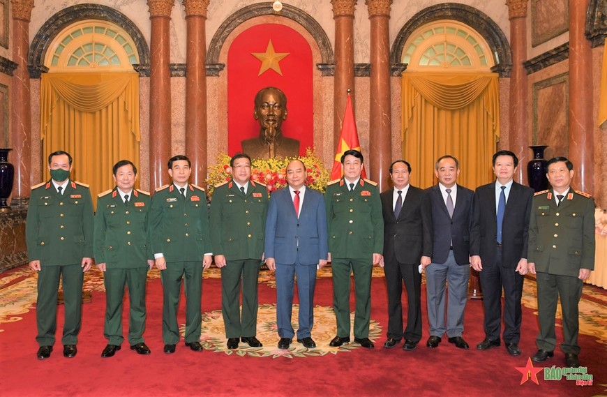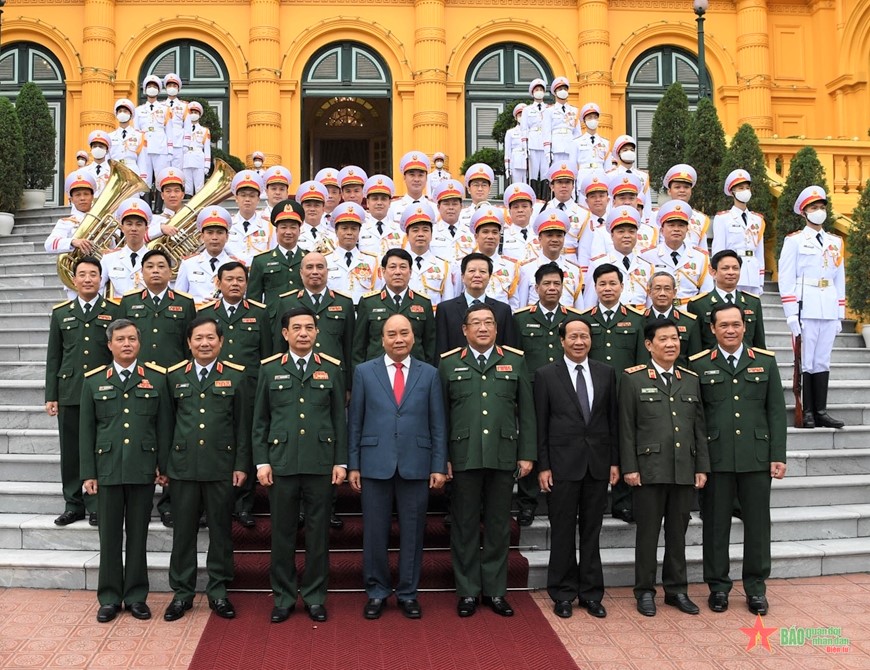 Chủ tịch nước Nguyễn Xuân Phúc, lãnh đạo Bộ Quốc phòng và các ban, ngành chúc mừng Thượng tướng Phạm Hoài Nam. Ảnh: PHÚ SƠN.