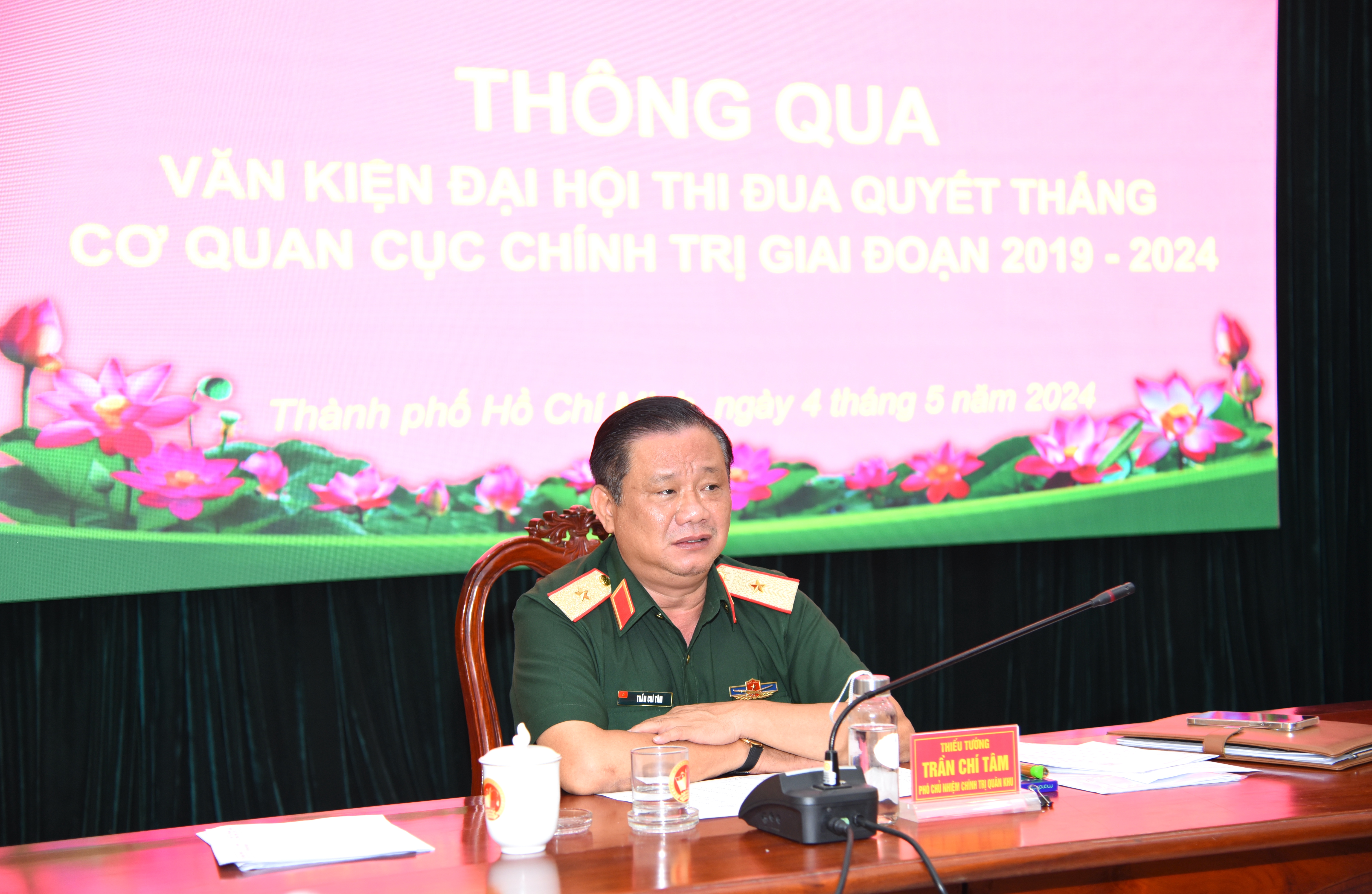 Thiếu tướng Trần Chí Tâm, Bí thư Đảng ủy Cục Chính trị, Phó Chủ nhiệm Chính trị Quân khu chủ trì hội nghị.