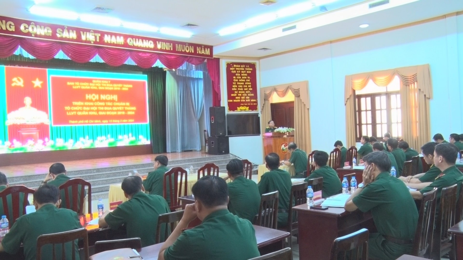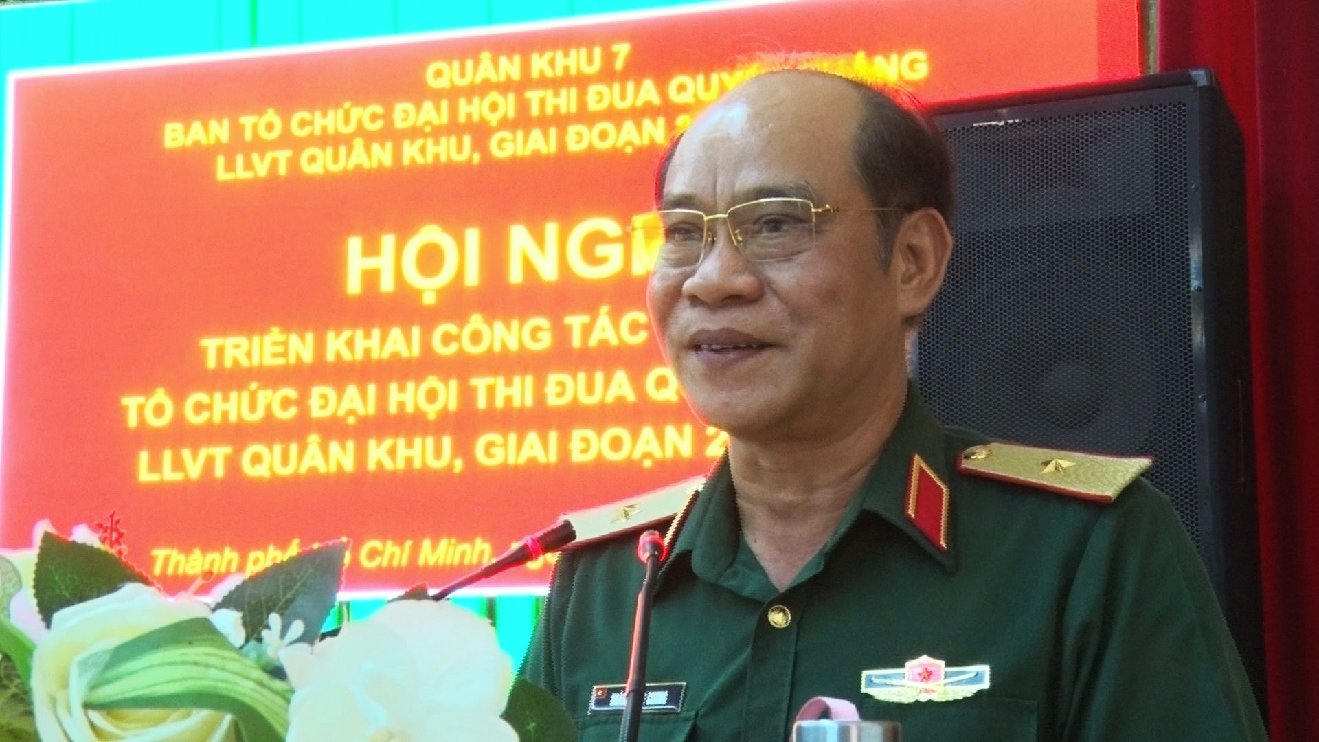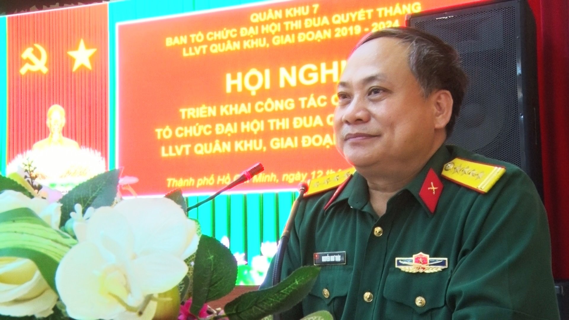 Thiếu tướng Hoàng Đình Chung, Ủy viên Thường vụ Đảng ủy Quân khu, Chủ nhiệm Chính trị Quân khu, Phó trưởng Ban Thường trực Ban Tổ chức Đại hội Thi đua Quyết thắng LLVT Quân khu, giai đoạn 2019 – 2024 phát biểu chỉ đạo tại hội nghị.