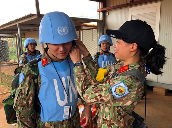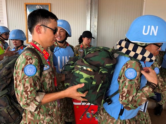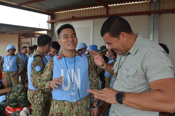 Thiếu uý Sa Minh Ngọc (bên phải) chỉnh lại quân trang cho đồng nghiệp trước khi lên máy bay về Bentiu.