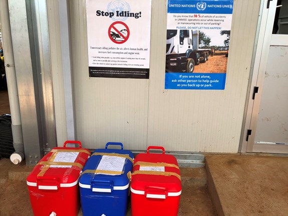 Các thùng vaccine trữ lạnh được đưa lên máy bay để đến Bentiu.