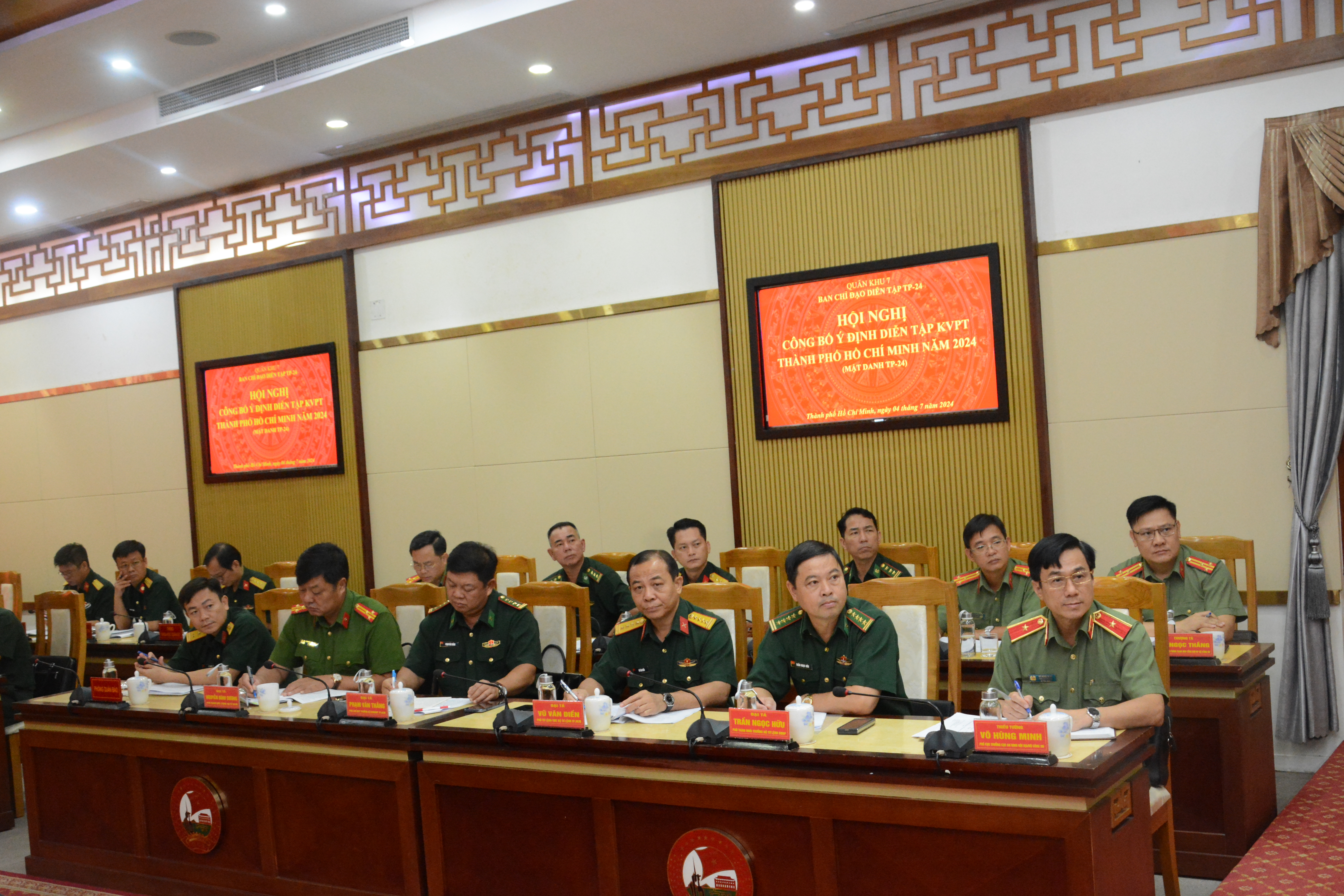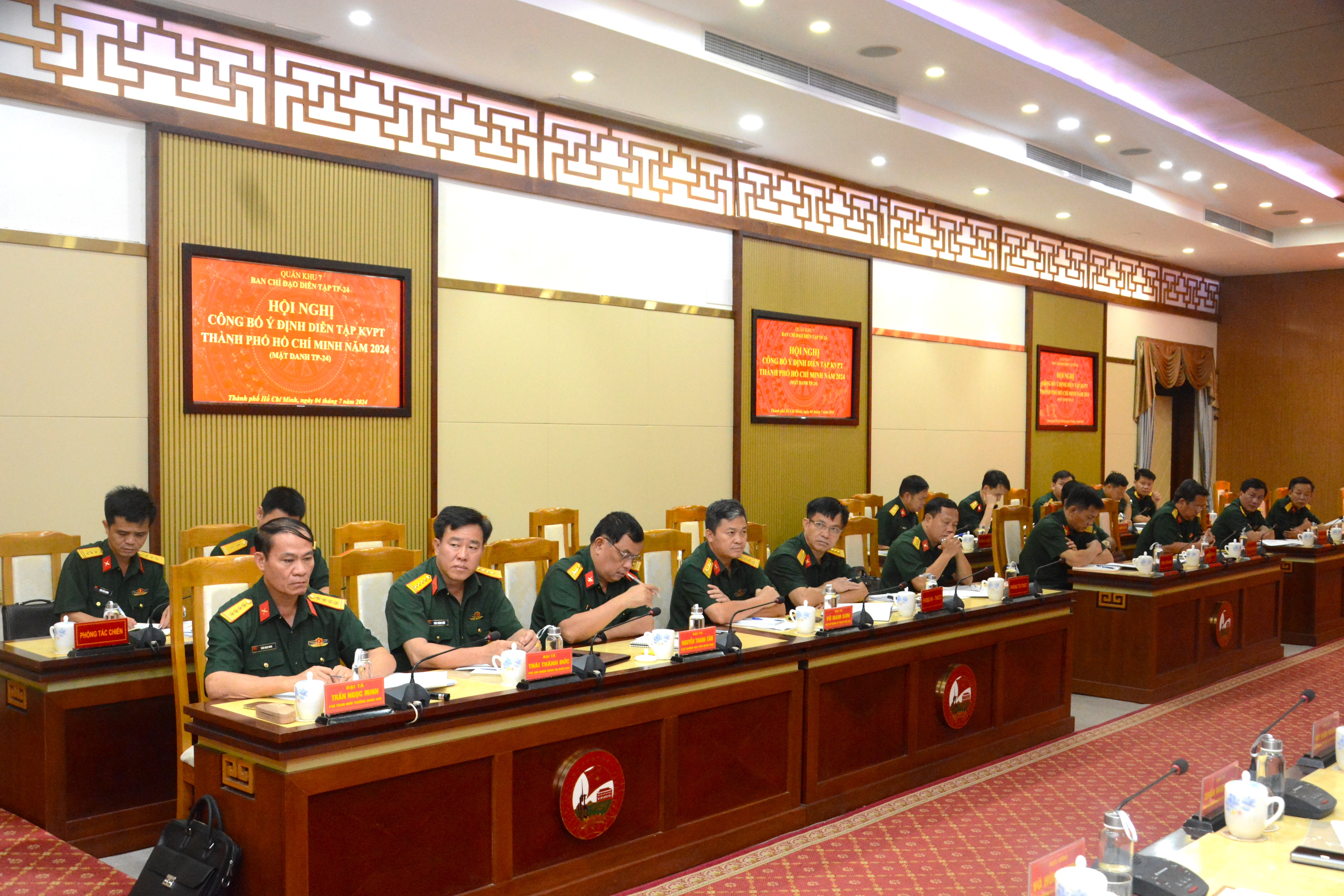 Tại hội nghị, các đại biểu được nghe quán triệt văn bản của Bộ Tổng Tham mưu về việc phê chuẩn Ý định diễn tập khu vực phòng thủ TP.HCM năm 2024; Chỉ thị diễn tập khu vực phòng thủ TP.HCM năm 2024 của Tư lệnh Quân khu; công bố các quyết định và phổ biến một số nội dung chính trong Ý định diễn tập khu vực phòng thủ.