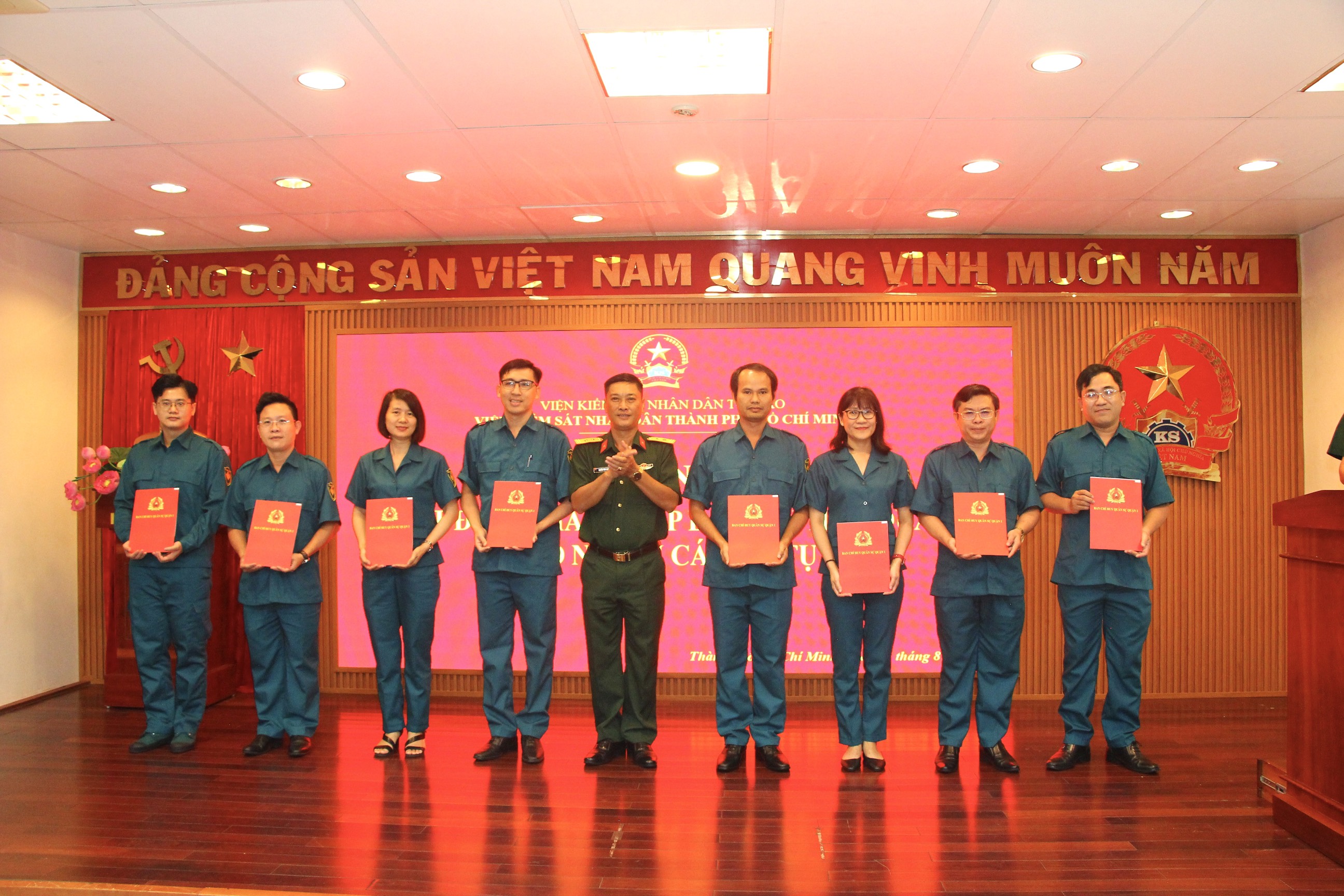 (QK7 Online) - Chiều ngày 21/8, tại Viện Kiểm sát Nhân dân TPHCM, Lễ công bố Quyết định thành lập Ban Chỉ huy Quân sự và bổ nhiệm cán bộ tự vệ diễn ra trang trọng. Tham dự có Đại tá Trần Văn Trai, Phó Tư lệnh Bộ Tư lệnh TPHCM; đồng chí Nguyễn Đức Thái, Viện trưởng Viện Kiểm sát Nhân dân TPHCM.