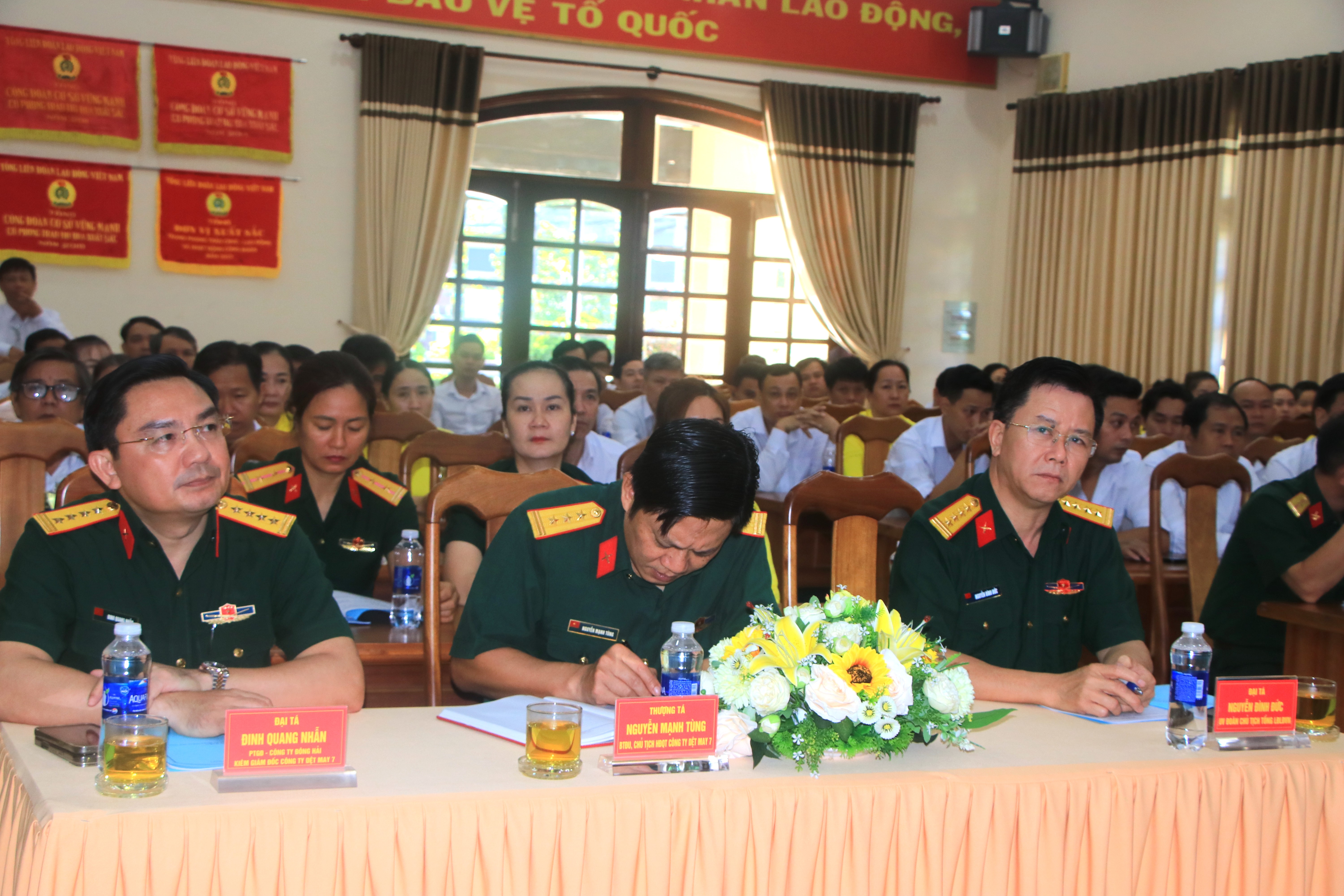 (QK7 Online) - Ngày 12/3, Công ty Cổ phần Dệt may 7 tổ chức Hội nghị đại biểu người lao động năm 2025. Tham dự Hội nghị có Đại tá Đinh Quang Nhẫn, Phó Tổng giám đốc Công ty Đông Hải, Giám đốc Công ty Cổ phần Dệt may 7; Thượng tá Nguyễn Mạnh Tùng, Bí thư Đảng ủy, Chủ tịch Hội đồng Quản trị Công ty Cổ phần Dệt may 7 cùng hơn 100 cán bộ, người lao động công ty.
