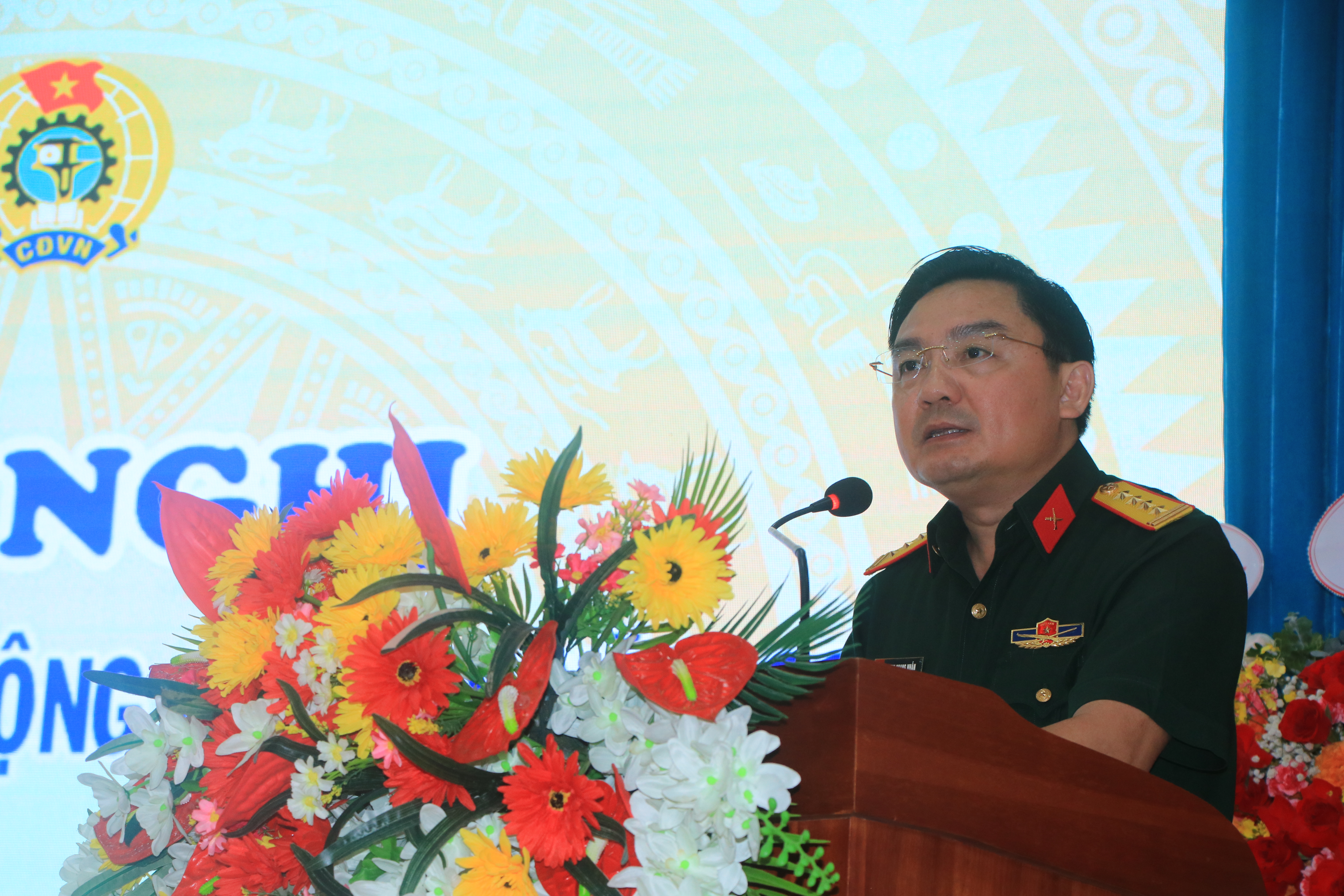 Đại tá Đinh Quang Nhẫn phát biểu tại hội nghị.