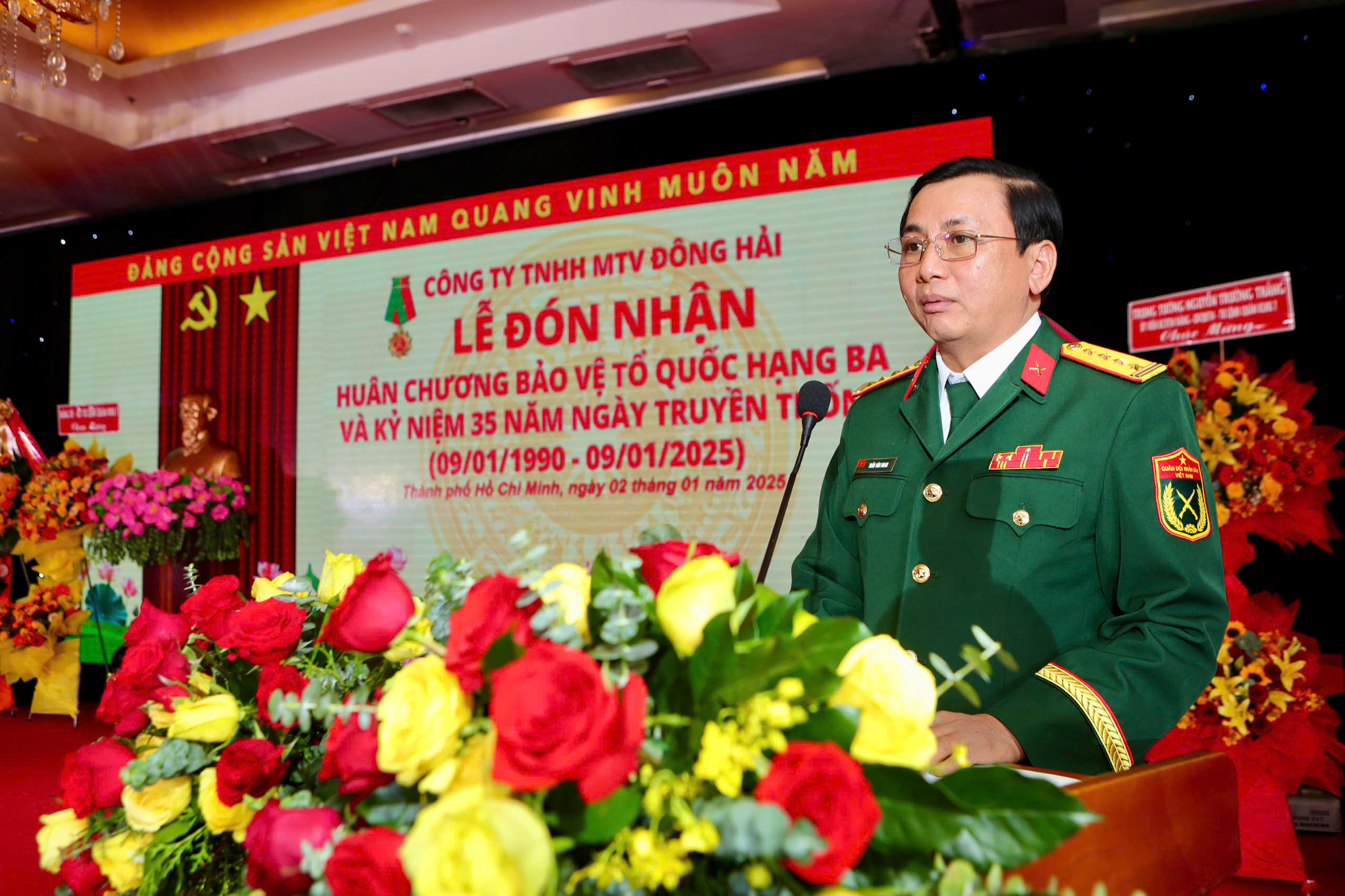 (QK7 Online) - Sáng 2/1, Công ty Đông Hải long trọng tổ chức Lễ đón nhận Huân chương Bảo vệ Tổ quốc hạng Ba và kỷ niệm 35 năm ngày truyền thống công ty (9/1/1990 - 9/1/2025). Trung tướng Nguyễn Trường Thắng, Ủy viên Trung ương Đảng, Ủy viên Quân ủy Trung ương, Tư lệnh Quân khu 7 dự và phát biểu chúc mừng.