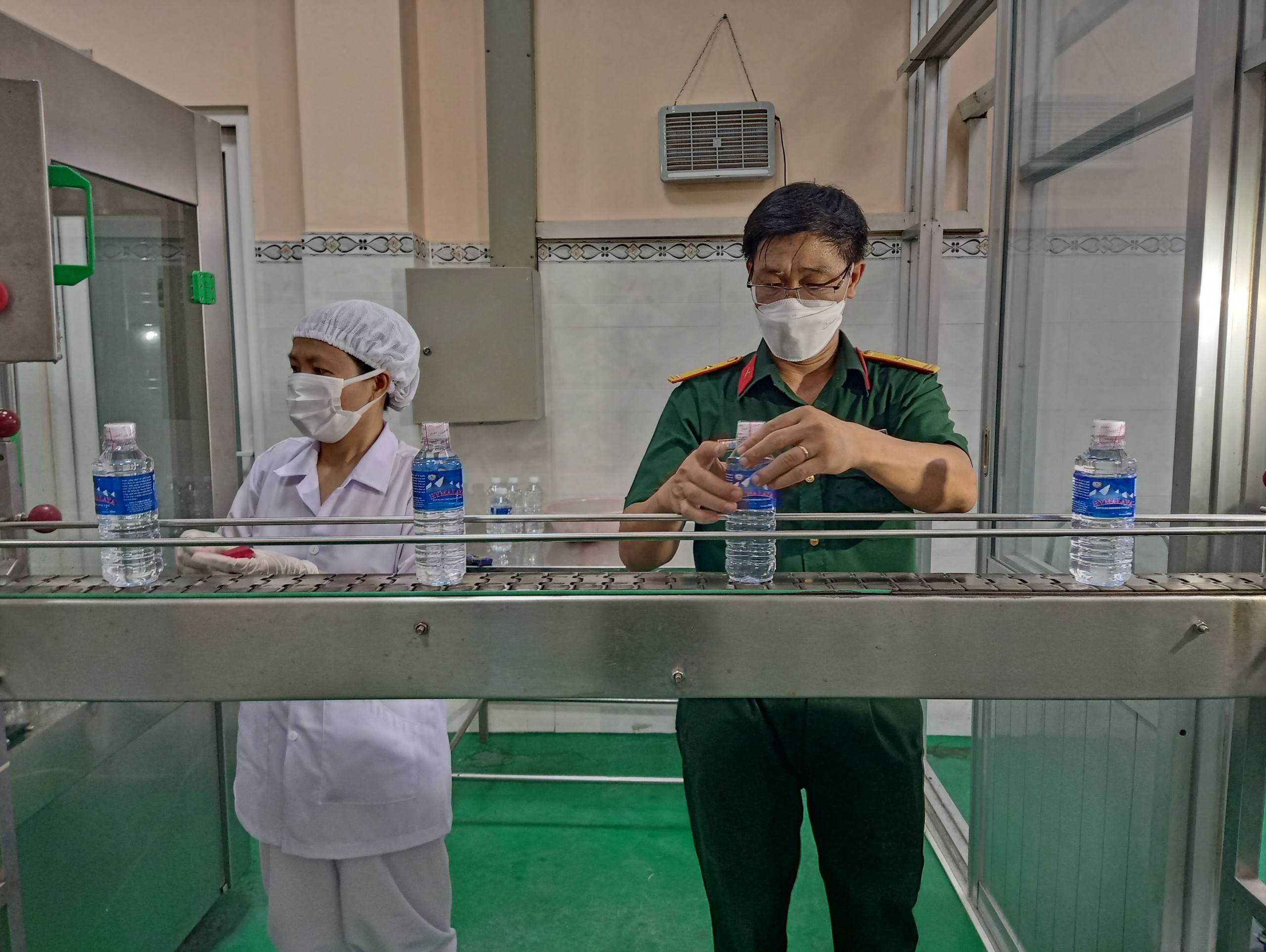 Thiếu tá Vũ Trọng Luật, Phó Giám đốc Xí nghiệp chế biến Nông sản - Thực phẩm kiểm tra chất lượng sản phẩm nước uống đóng chai.