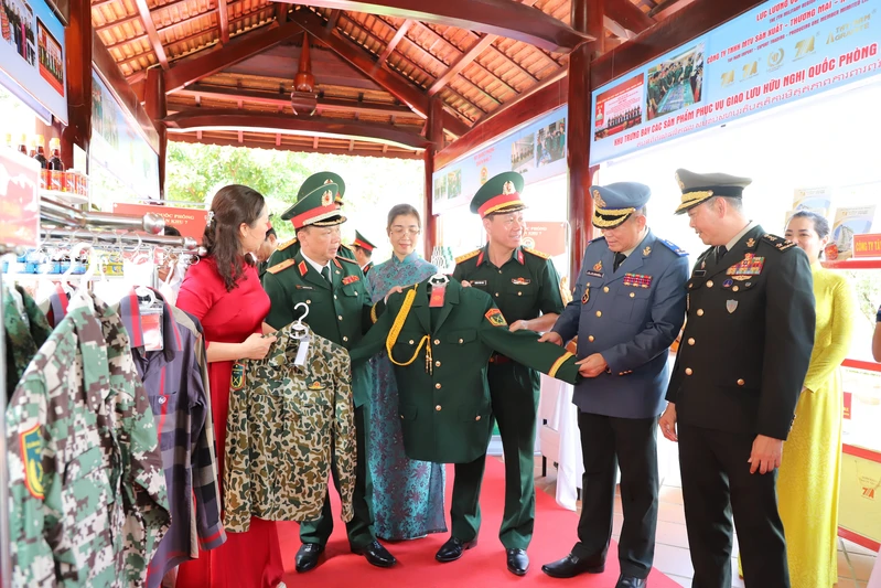 Đại tá Nguyễn Tấn Linh, Phó Tư lệnh Quân khu (thứ 5 bên trái qua) tham quan gian hàng Công ty Đông Hải tại Hội chợ kết nối giao thương Việt Nam – Lào. Ảnh: Ngọc Tuân
