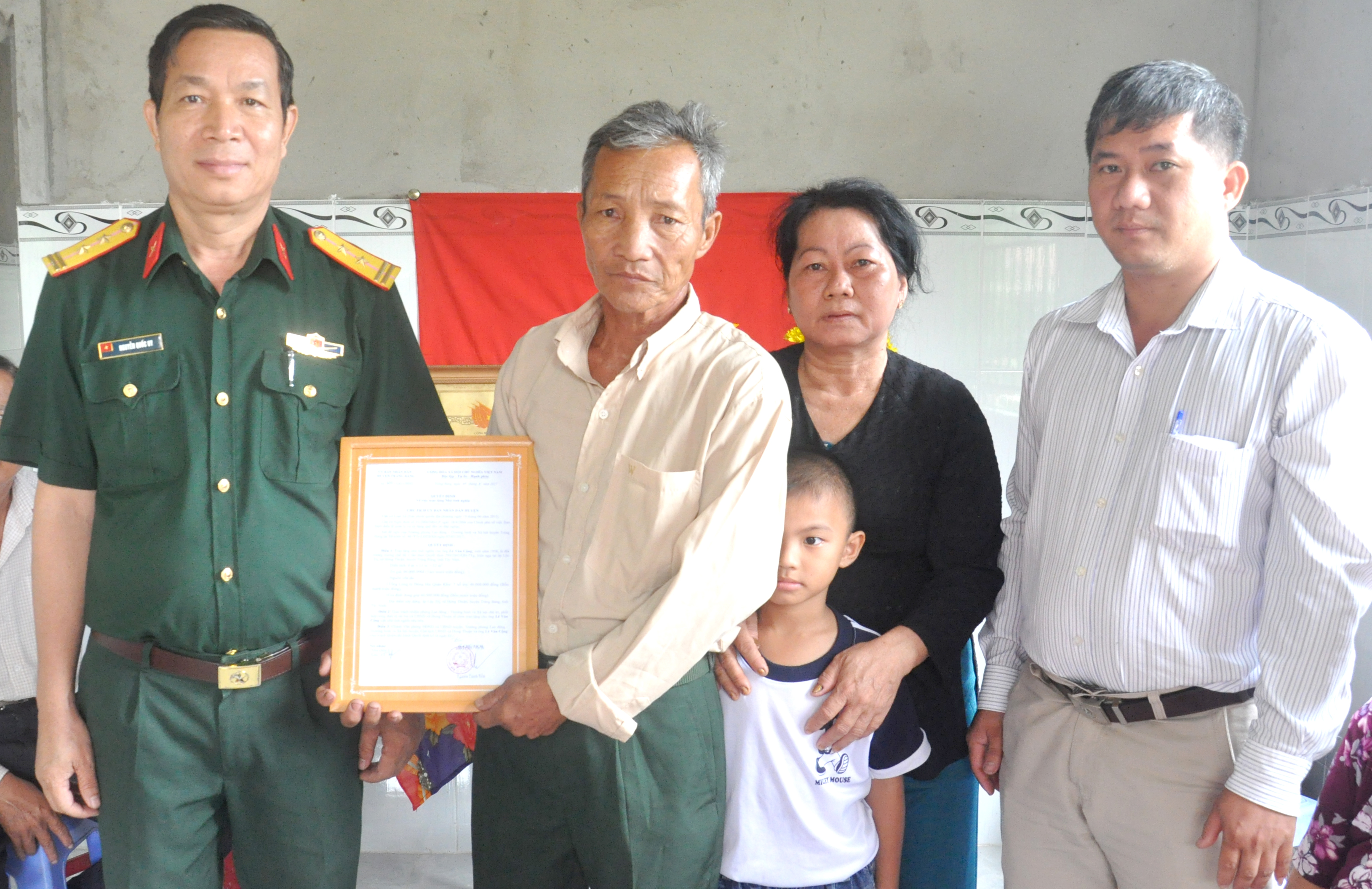 Trung tá Nguyễn Quốc Uy trao quyết định tặng nhà cho gia đình ông Lê Văn Cộng