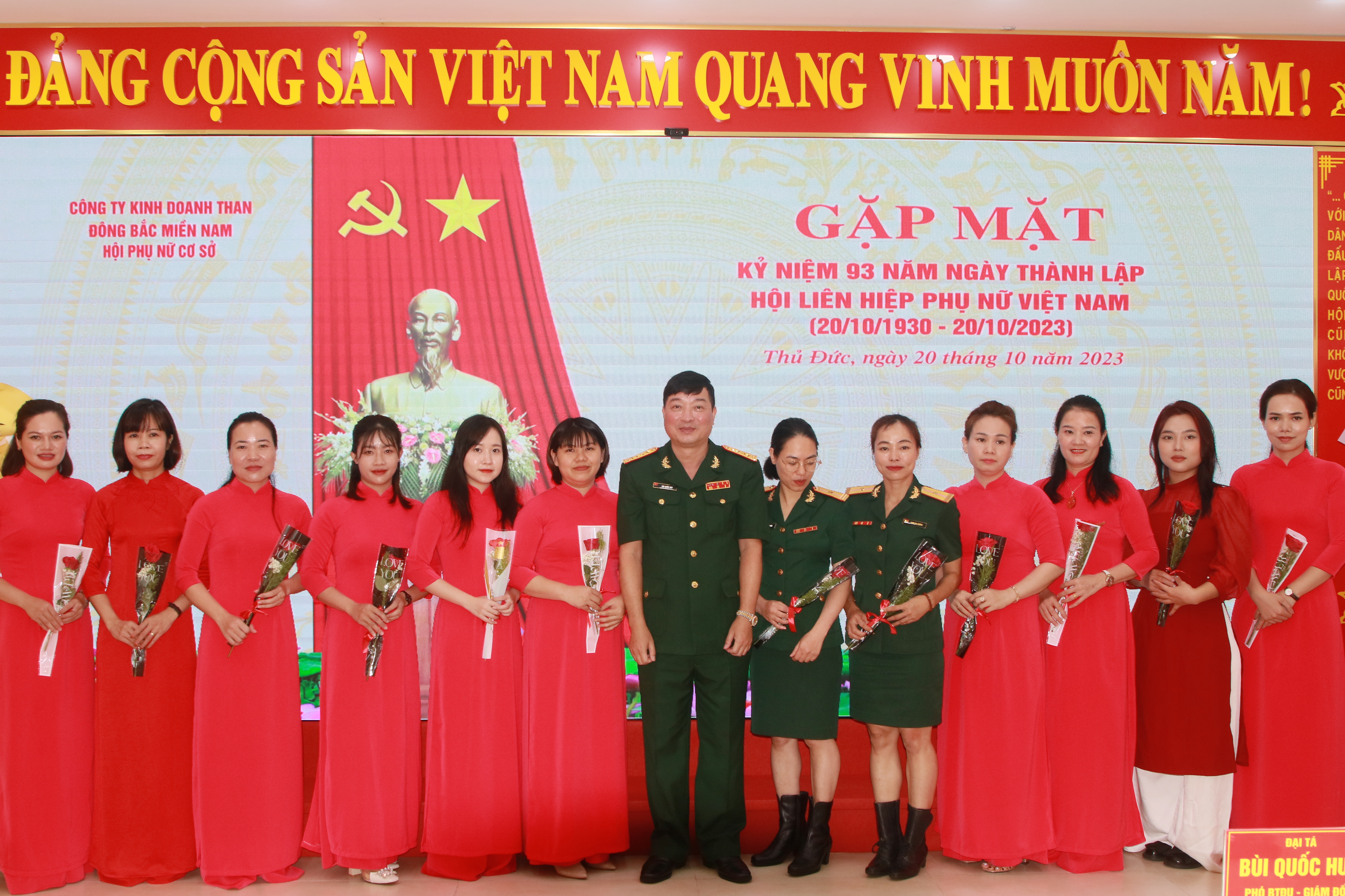 Dịp này, Hội phụ nữ Công ty tổ chức gặp mặt nhân kỷ niệm 93 Ngày thành lập Hội Liên hiệp Phụ Nữ Việt Nam (20/10/1930-20/10/2023). Thượng tá Phạm Văn Đại chúc mừng và mong muốn Hội Phụ nữ Công ty sẽ cùng nhau đoàn kết, khơi dậy tiềm năng, phát huy trí tuệ xây dựng tổ chức Hội vững mạnh xuất sắc, phối hợp chặt chẽ với cơ quan, đơn vị trực thuộc, các tổ chức quần chúng khác trong Công ty thực hiện tốt chỉ thị, nghị quyết của Đảng, kế hoạch của chỉ huy, nhất là các nội dung, chỉ tiêu phong trào thi đua quyết thắng hàng năm. Đồng thời mong muốn cán bộ, hội viên tiếp tục phấn đấu xây dựng người phụ nữ có tri thức, sức khỏe, có lối sống văn hóa, lòng nhân hậu, thủy chung, xây dựng gia đình no ấm, bình đẳng, tiến bộ, hạnh phúc, góp phần xây dựng tổ chức Đảng trong sạch vững mạnh, cơ quan, đơn vị vững mạnh toàn diện “mẫu mực, tiêu biểu”, hoàn thành xuất sắc nhiệm vụ của công ty.