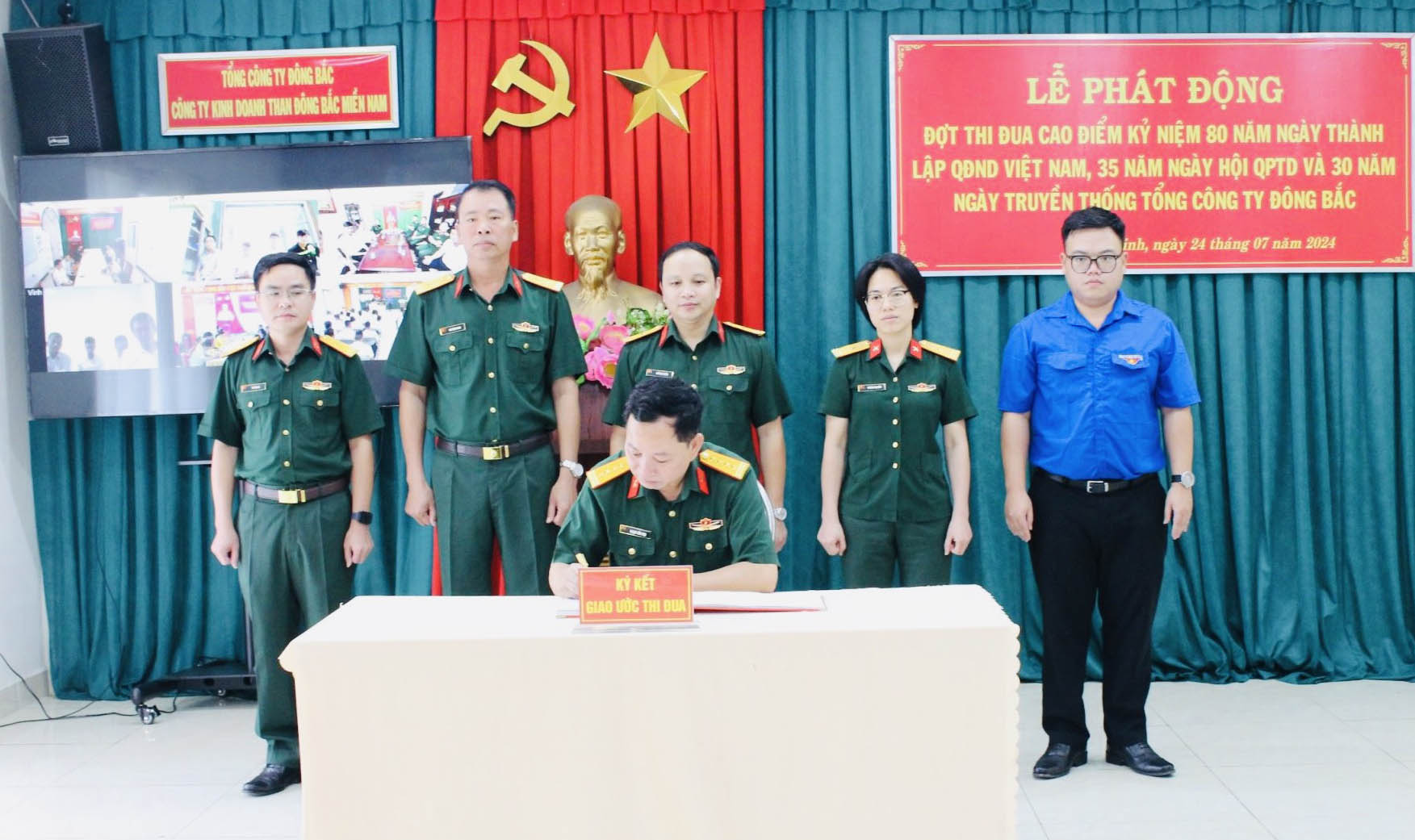 Tiếp nối, Trung tá QNCN Lưu Công Hoan, Phụ trách Trạm trưởng Trạm Chế biến và Kinh doanh Vân Phong đại diện cho toàn thể cán bộ, CNVC, người lao động trong toàn Công ty phát biểu giao ước thi đua, đồng thời đại diện khối cơ quan, khối Trạm và các tổ chức quần chúng cũng đã ký kết thi đua. Toàn thể cán bộ, nhân viên thể hiện tinh thần thống nhất, quyết tâm cao thực hiện thắng lợi các nội dung, chỉ tiêu đề ra nhằm chào mừng các sự kiện đặc biệt của đất nước, quân đội và Tổng Công ty Đông Bắc.