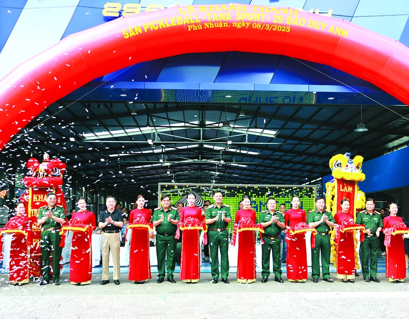 Trung tướng Nguyễn Trường Thắng, Ủy viên Trung ương Đảng, Tư lệnh Quân khu 7 (nay Thượng tướng Nguyễn Trường Thắng, Ủy viên Trung ương Đảng, Thứ trưởng Bộ Quốc phòng); Thiếu tướng Trần Vinh Ngọc, Bí thư Đảng ủy, Chính ủy Quân khu 7 cùng các đại biểu cắt băng khánh thành Cụm sân Pickleball - Tana Sport Công ty Tây Nam. Ảnh: Hằng Ny