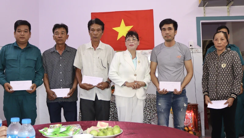 Bà Trần Thị Kim Thành, phu nhân Thiếu tướng Đặng Văn Lẫm, Phó Tư lệnh Quân khu tặng quà cho các gia đình.