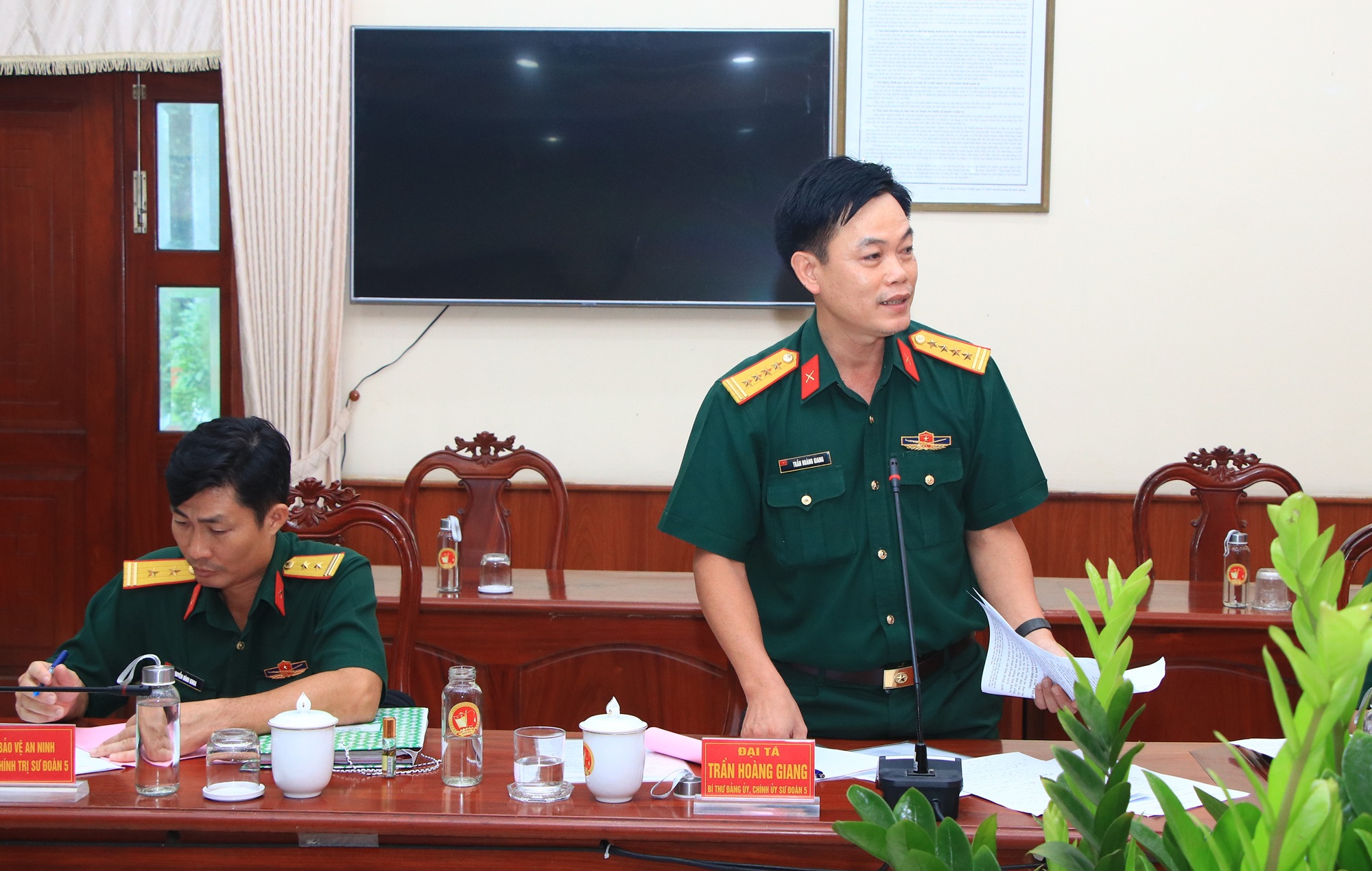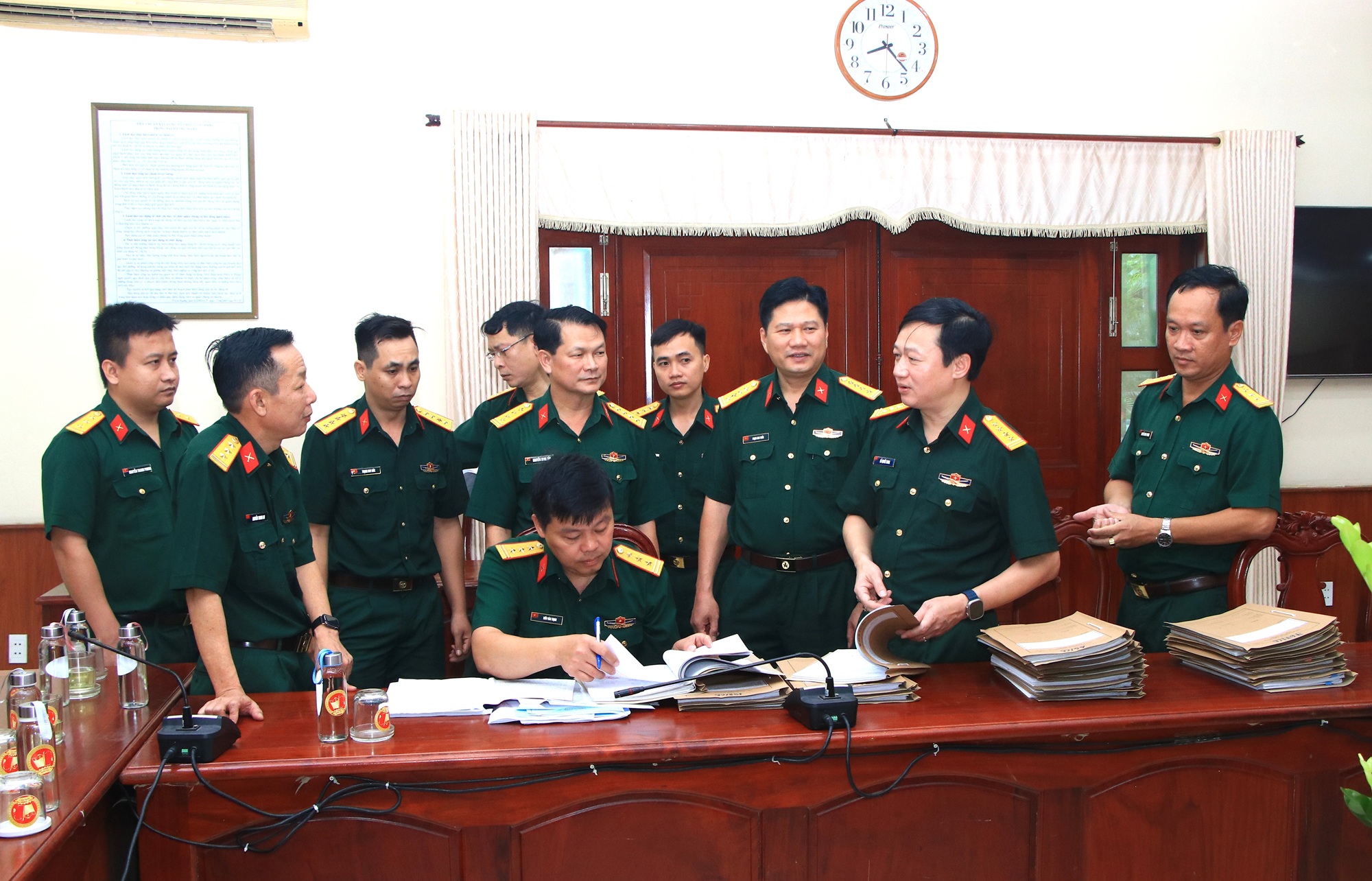 Đoàn kiểm tra hồ sơ, tài liệu công tác rà soát chính trị nội bộ của Bộ CHQS tỉnh Long An. Đại tá Trần Hoàng Giang, Chính ủy Sư đoàn 5 báo cáo với đoàn về kết quả công tác bảo vệ chính trị nội bộ của đơn vị.