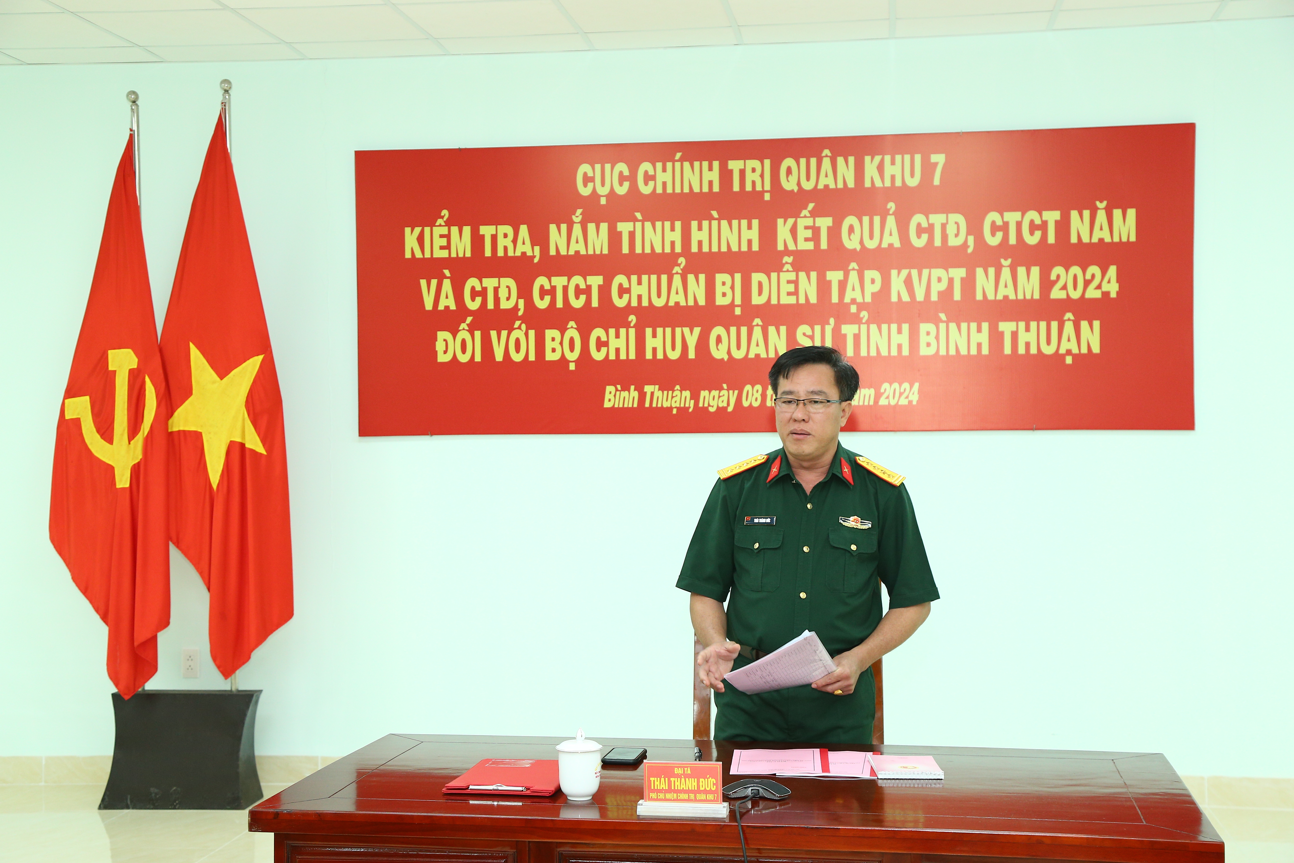 Kết luận kiểm tra, Đại tá Thái Thành Đức, Phó Chủ nhiệm Chính trị Quân khu đề nghị Bộ CHQS tỉnh Bình Thuận tiếp thu và khắc phục toàn bộ những hạn chế mà đoàn đã chỉ ra; củng cố cơ quan Phòng Chính trị, đồng thời kiểm tra, phúc tra, giám sát, hướng dẫn hoạt động CTĐ, CTCT cấp cơ sở chặt chẽ, tốt hơn; chỉnh sửa, bổ sung, hoàn thiện các văn bản, báo cáo công tác diễn tập; tiếp tục thực hiện hiệu quả các chủ trương, mô hình, phong trào thi đua của Quân khu; phối hợp chặt chẽ với các địa phương nắm chắc địa bàn, tình hình dân tộc, tôn giáo kết hợp làm tốt công tác dân vận, chính sách, hỗ trợ giúp đỡ Nhân dân, đồng bào dân tộc có hoàn cảnh khó khăn; thường xuyên quan tâm, giáo dục chính trị, tư tưởng cũng như chăm lo đời sống vật chất, tinh thần cho cán bộ, chiến sĩ.