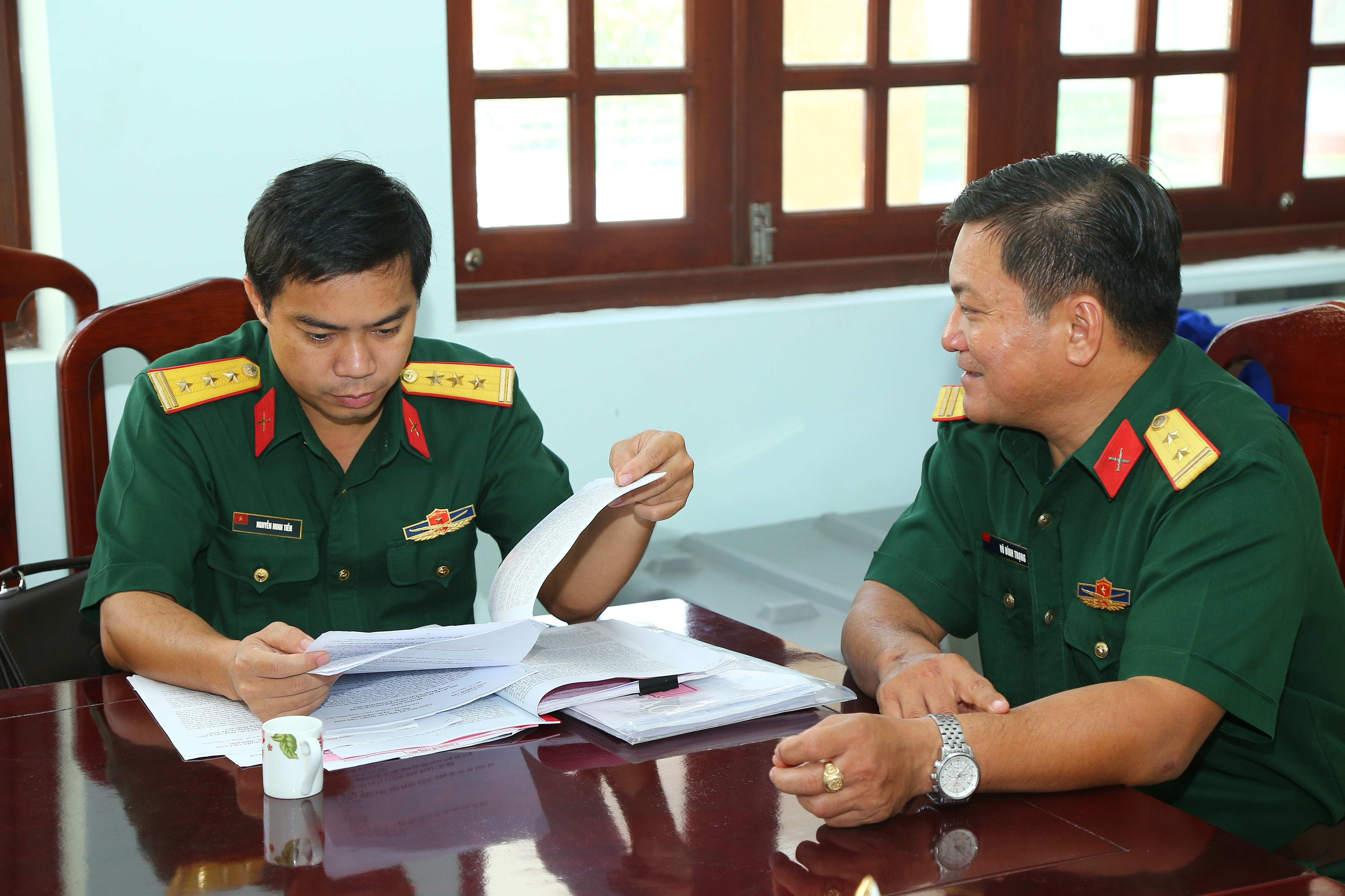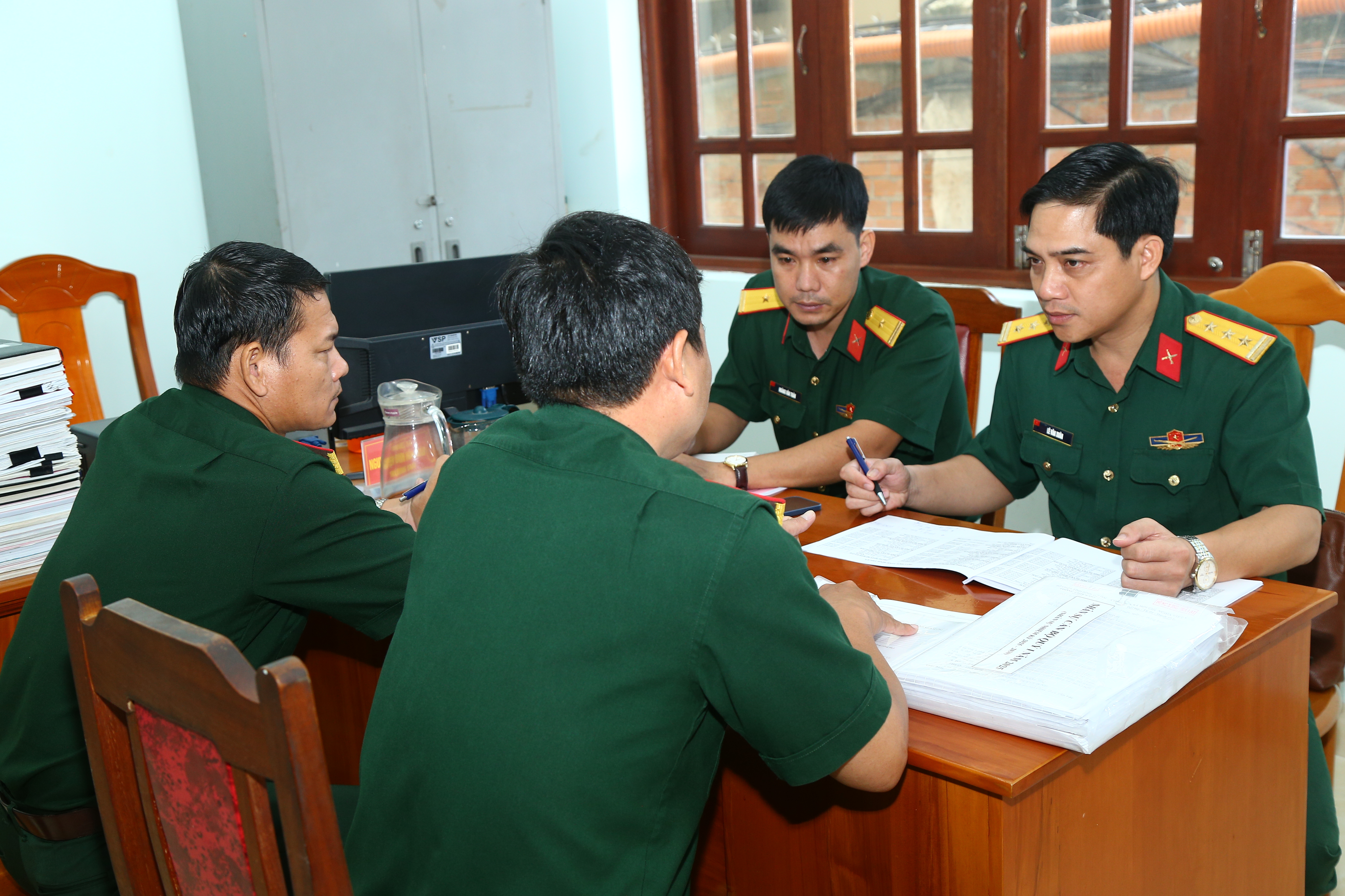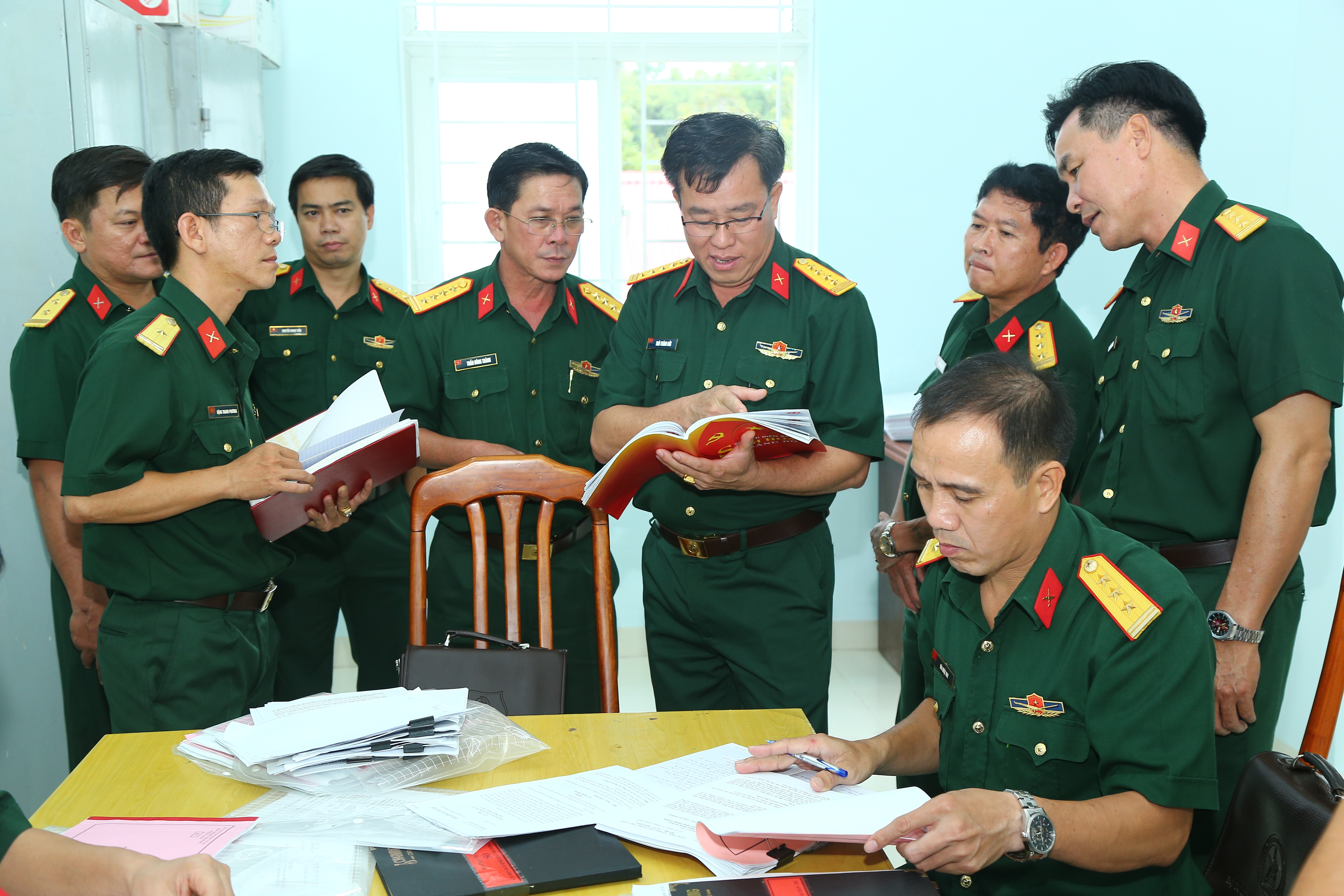 Đại tá Thái Thành Đức, Phó Chủ nhiệm Chính trị Quân khu (giữa) kiểm tra văn kiện CTĐ, CTCT.