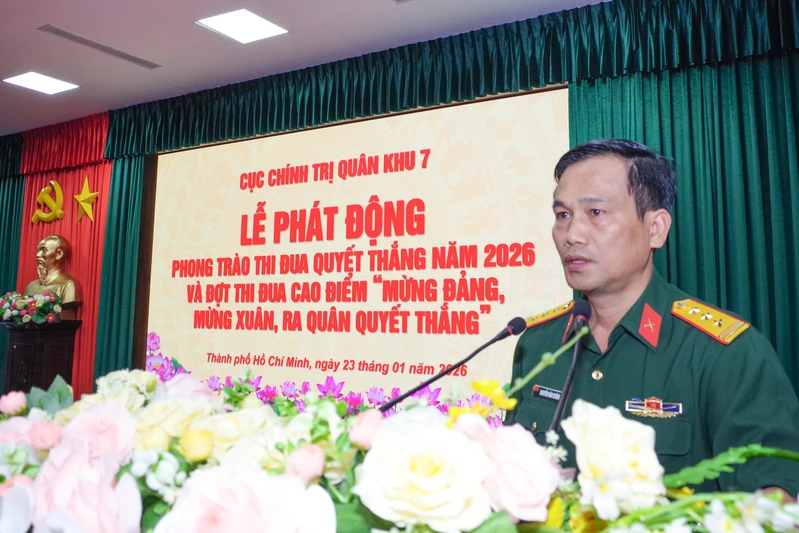 (QK7 Online) - Sáng 23/1, Cục Chính trị Quân khu 7 tổ chức phát động phong trào TĐQT năm 2026 và đợt thi đua cao điểm “Mừng Đảng, mừng Xuân, ra quân Quyết thắng”. Thiếu tướng Trần Đức Thắng, Bí thư Đảng ủy Cục Chính trị, Phó Chủ nhiệm Chính trị Quân khu chủ trì buổi lễ.