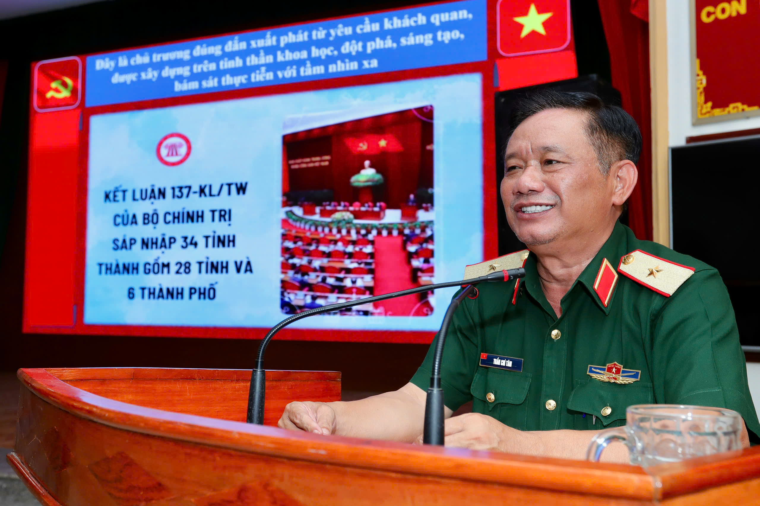 Thiếu tướng Trần Chí Tâm, Bí thư Đảng ủy Cục Chính trị, Phó Chủ nhiệm Chính trị Quân khu phát biểu tại buổi sinh hoạt.
