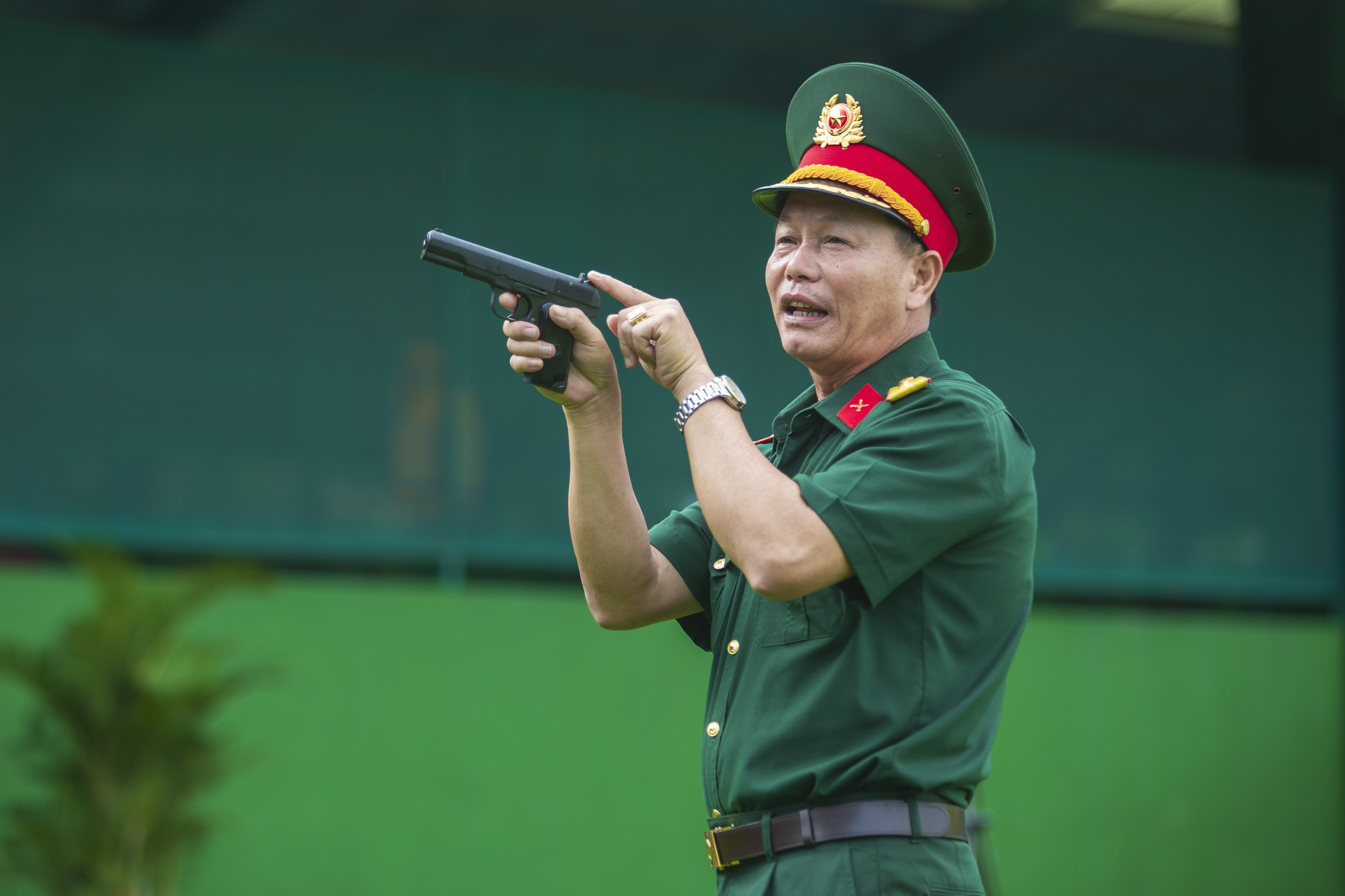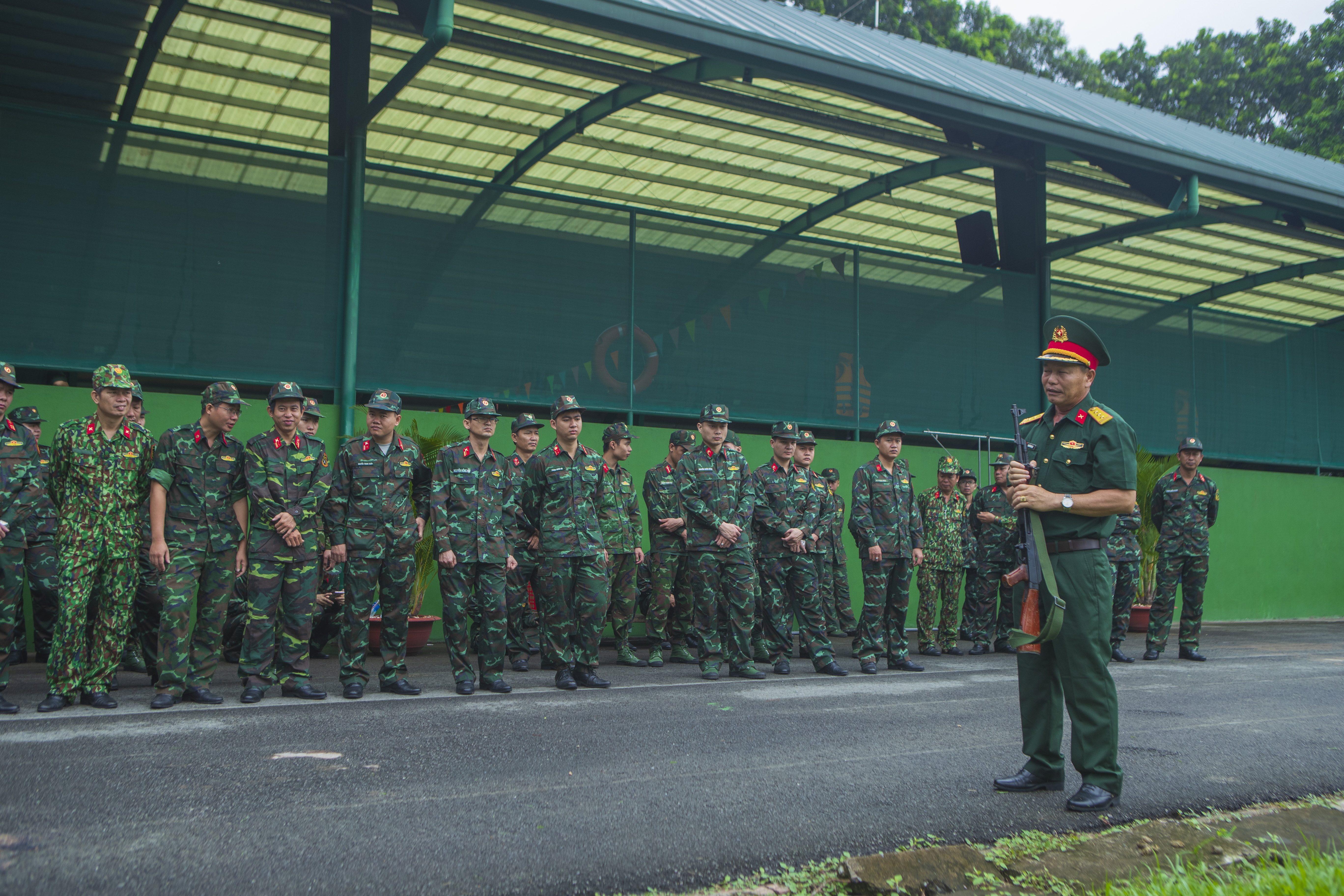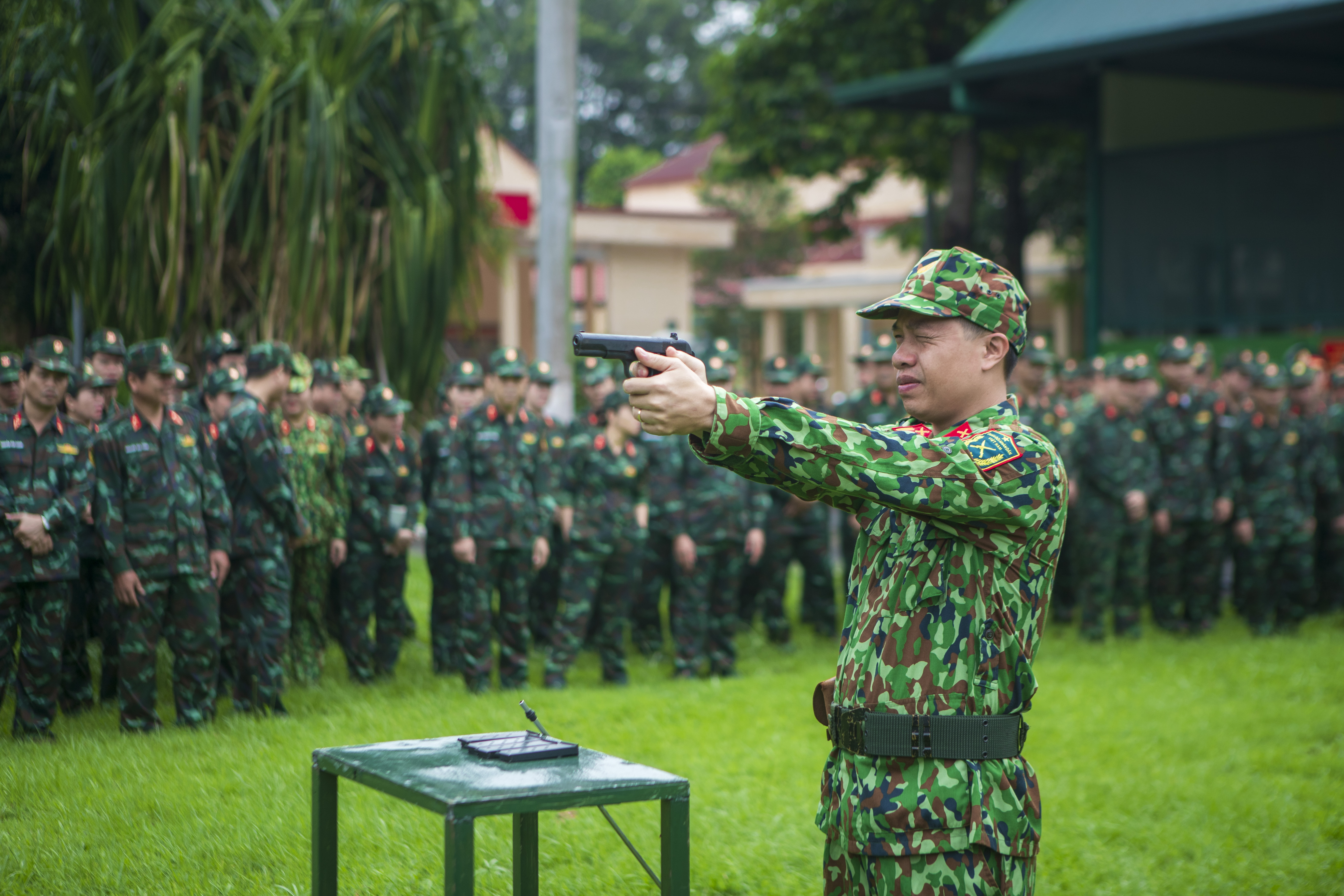 Cán bộ Phòng Quân huấn nhà trường tập huấn kỹ thuật ngắm và cơ chế vận hành súng ngắn K54.